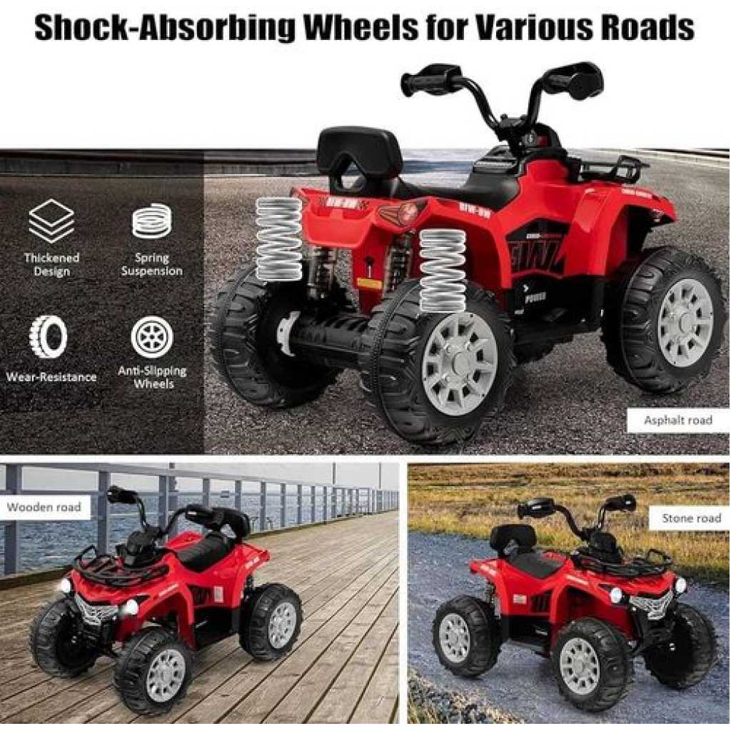 Description: Cheer your kids up with our four-wheeler ATV. This kids’ ride on ATV has quite an impressive outlook close to the real version to meet kids’ imagination. The headlights presents a more realistic atmosphere while the media functions of story, education and music allow kids to enjoy more. The built in USB socket and the MP3 interface with cable enable you to download your kid’s favorite songs and stories for your kids. This ride on car offers your kids high speed, and low speed driving with the ability to drive in reverse. and it is suitable for ride on most of the ground thanks to the oversized & shock absorbing wheels. The large 12V 7Ah battery supports lasting and continuous enjoyment. Features: Realistic design with vivid details meets every little racer’s dream A solid choice in kid’s holiday gift list for the 3 to 8 years old Equipped with headlights to fascinate your kids Oversized wheels conquer most of the road, be it sidewalks, wooden & tar roads and more The media function includes music, education, story,built in USB, MP3 sockets Your kid can adjust volume, switch from previous to next Kids can enjoy realistic driving forward and backward and experience slow and fast speeds Please remove the high speed protective cover before let your kids push shifter into the “high speed” position This ride on car is accelerated by the foot pedal 12V 7Ah rechargeable battery for lasting fun and enjoyment Specification: Color: Red, Black, Blue, Pink Material: Steel, PP Product Dimension: 39” x 24” x 29”(L x W x H) Maximum Capacity: 66 lbs Adaptable Age: 3-8 Years Battery: 12V 7Ah Net Weight: 35.4 lbs Speed: 1.9-3.7 mph Play Time: 40 Minutes Package Includes: 1 x Kids’ Ride On ATV 1 x MP3 Cable 1 x Charger Coolest Kids’ Ride On Car Toy: Certified by ASTM and CPSIA, our electric kids ATV meets the highest safety standards. Our toddler 4 wheeler features a realistic outlook mimicking the real beach ATV with fantastic details. The dashing LED headlights meets the imagination and build up the adventure of kids’ fantasies. Beyond this, the storage basket in the front of the car can hold your cute toys like shovels, books, etc. Early Driving Impression & Fun: Your kids can practice their control of directions through foot pedal, as well as take a funny reverse. They can as well enjoy driving thrills at varying speeds from lower 1.9 to fast 3.7 mph,which is totally in a safe range. Please remove the protective cover before starting the high speed gear. Entertaining Interactions: Our ride on ATV allows kids to tune in to music, story, and education. They can also adjust the volumes and switch from the previous and the next songs. With USB and MP3 sockets, it is possible to jam on your kids’ selection of songs and nursery rhymes. A MP3 cable is included in the package. Travels Everywhere & Long-time Fun: Featuring 4 wide wheels, this power wheels atvs is an ideal ride for flat ground, rubber track, cement road and more. The rear wheels are equipped with spring suspensions to greatly reduce the shock during traveling and enable the kids to cruise stably. Featuring a lasting 12V 7 Ah battery, the single charge will take for 8 to 10 hours and can provide 40 minutes of continuous fun (depending on the type of use) Ideal Toy to Accompany Your Children—Costzon Ride on ATV build your child’s sense of imagination and adventure. Send it to your boys or girls as a Christmas birthday gift. Let it accompany your kids and create cherished childhood memory. Recommended for children 3-8 years old, and the maximum capacity is 66 lbs.