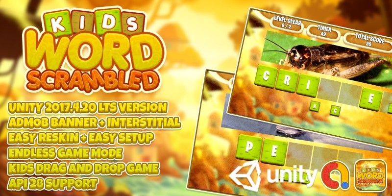 Kids Word Scrambled - Complete Unity Project. Kids Word Scrambled (Drag And Drop) + Unity3d LTS + Admob Ads Ready + EASY Reskin