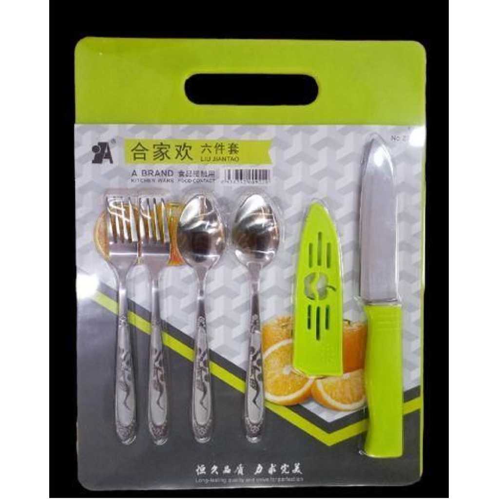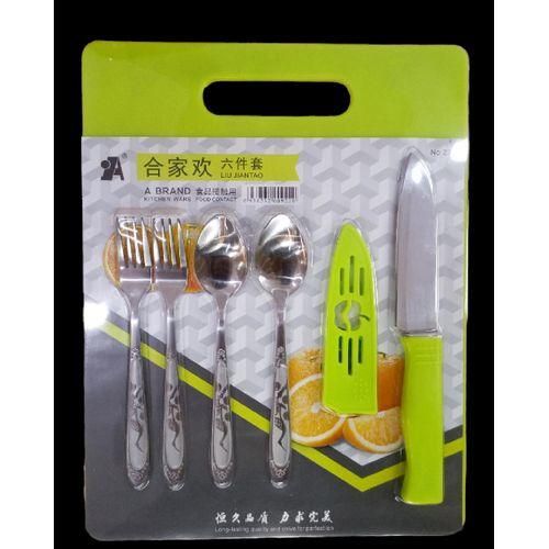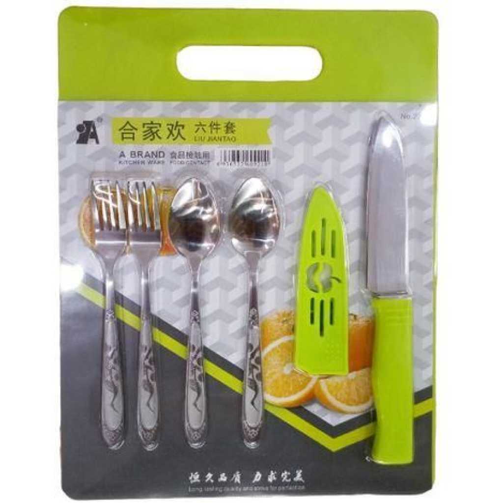 This is a simple but hard simple home kitchen set it has large and strong chopping board two hard spoons two hard forks and and a sharp kitchen multipurpose knife Key Features: Chopping board Two spoons Two forks Knife Unique design