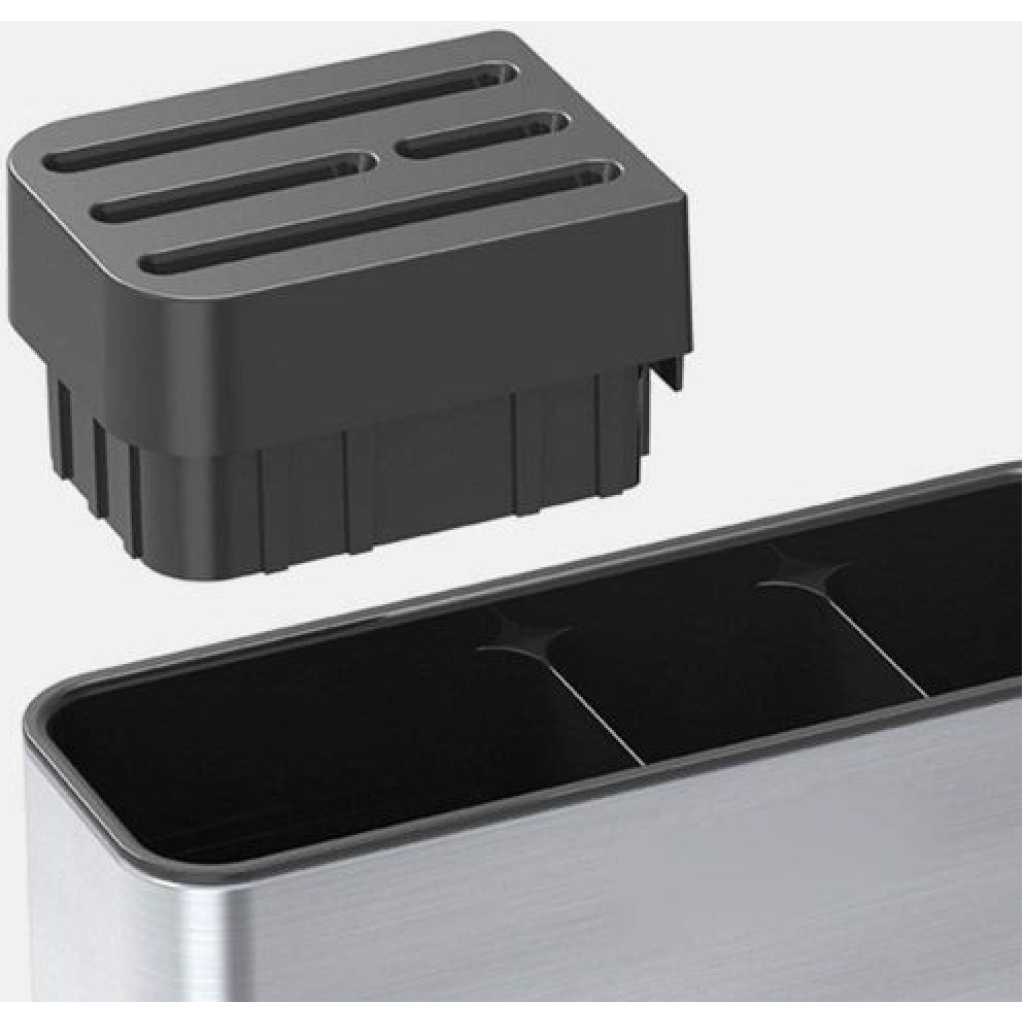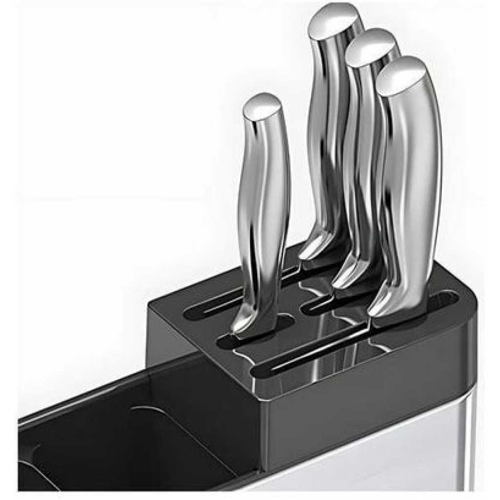 Key Features: Cutlery, hollow design is ventilated, clean, ventilated, and easy to drain. Hole out, ventilate and drain in all aspects to protect health, and store in separate compartments Tableware, thick 304 stainless steel, thick material, 304 is not easy to rust, durable, Use kitchen space to store, do not occupy countertop space, kitchen utensils store knives, chopsticks, forks and spoons, External sandblasting process (anti-slip), internal 304 stainless steel (anti-rust), tableware. Function: Kitchen knives, chopsticks and spoons, tableware storage. It adopts a compartment design, classified storage, clean and tidy.