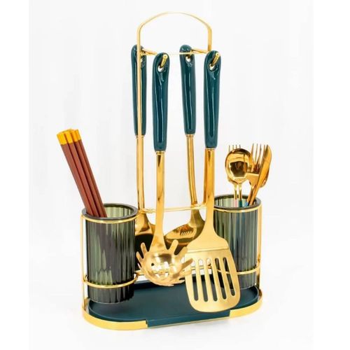 Kitchen Utensil Holder Countertop 2 Cups Cooking Cutlery Rack For Fork Spoon Knife Spatula- Green. SUPER MOISTURE-PROOF : There are 30 drain holes at the bottom of each container, It can make the water flow away faster, which can keep the inner dry. The iron frame makes the cup hanging in the air for better ventilation. INGENIOUS MATERIAL COMBINATION: The combination of an iron frame and translucent green plastic cup, makes the utensils holder look modern and avant-garde, simple and atmospheric. 2-CUP DESIGN: It has two separate utensil pots, which can classify your knives, forks, spoons, spatulas, whisks, and other cutlery. so that you can keep all kitchen utensils together, easy for you to take and use. LUXURIOUS DECORATION: The combination of matte pale gold and green bursts out a harmonious beauty, making it look textured. The golden frame is a light gold / bronze-gold. It’s time to decorate your kitchen with this beautiful and practical utensil jar. EASY TO CLEAN: The tray and 2 cups are removable, convenient for you to clean up stagnant water. Suggest you wash them regularly and dry them. Key Features: Kitchen Utensil Holder Countertop 2 Cups Cooking Cutlery Rack For Fork Spoon Knife Spatula- Green. The latest cutlery container looks modern and fashionable. Luxury iron art shows extraordinary taste. High-quality electroplating, long-lasting luster, is not easy to rust. Translucent container, it’s not easy to hide dirt. Double cup design, It can store more tableware. Organize your kitchen countertop neat and tidy. Each cup has 30 drain holes at the bottom, which can keep the inner dry. It has a beautiful iron frame, it hangs the cups in the air for better ventilation. The detachable tray is convenient for cleaning and can store other small items either.