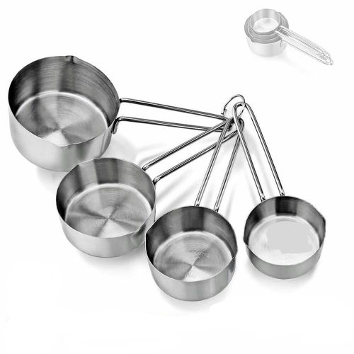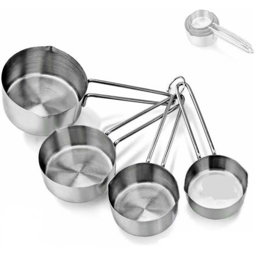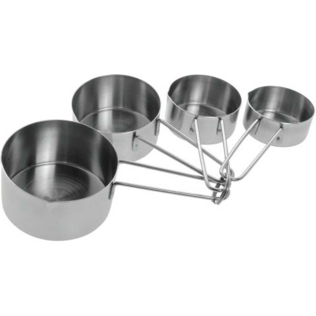 Kitchencraft Stainless Steel Measuring Cups and Spoons (4-piece Set). Quickly and easily ensure you have correct measurements with this set of four stylish, polished stainless steel measuring cups with clearly marked external ml and cup measuring guides, and wide, easy-to-grip handles. Includes 1/4, 1/2, 3/4, and one cup measures, and a storage ring to keep all cups together and ready at hand. Features Dishwasher Key Features: Kitchencraft Stainless Steel Measuring Cups and Spoons (4-piece Set). Say goodbye to conversion charts and open up a world of new recipes with these time-saving American-style cup measures. Made of lightweight, polished stainless steel, the cups won’t tarnish, melt, chip, or carry strong odors like garlic into other recipes. The cups come on a detachable, hangable ring, and nest together for easy storage. They have flat bases too, so they won’t tip over. Includes 4 cups, ranging from 60 ml (¼ cup) to 250 ml (1 cup). Each is engraved to show the size, and the largest has to measure lines. This set is a smart, everyday essential for cooking and baking. It’s easy to clean, and dishwasher safe.