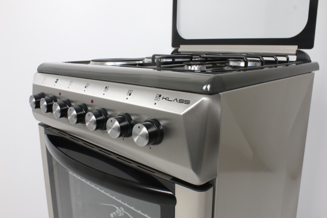 60x60cm electric oven up and down heating elements, thermostat E grill , 2muilt gas (euro type pool burner + 2rapid HP ,push button iginition for hob burners , metel top lid,bs plug, oven lamp , roteseries ,timer cool door ( removable inner glass ) 2 oven tray 1 oven grid, glass flap drawer , hob marble black/ command panel matt inox -rest silver grey paited