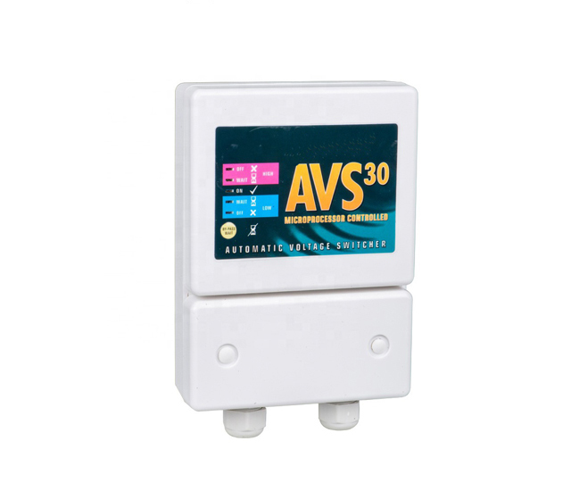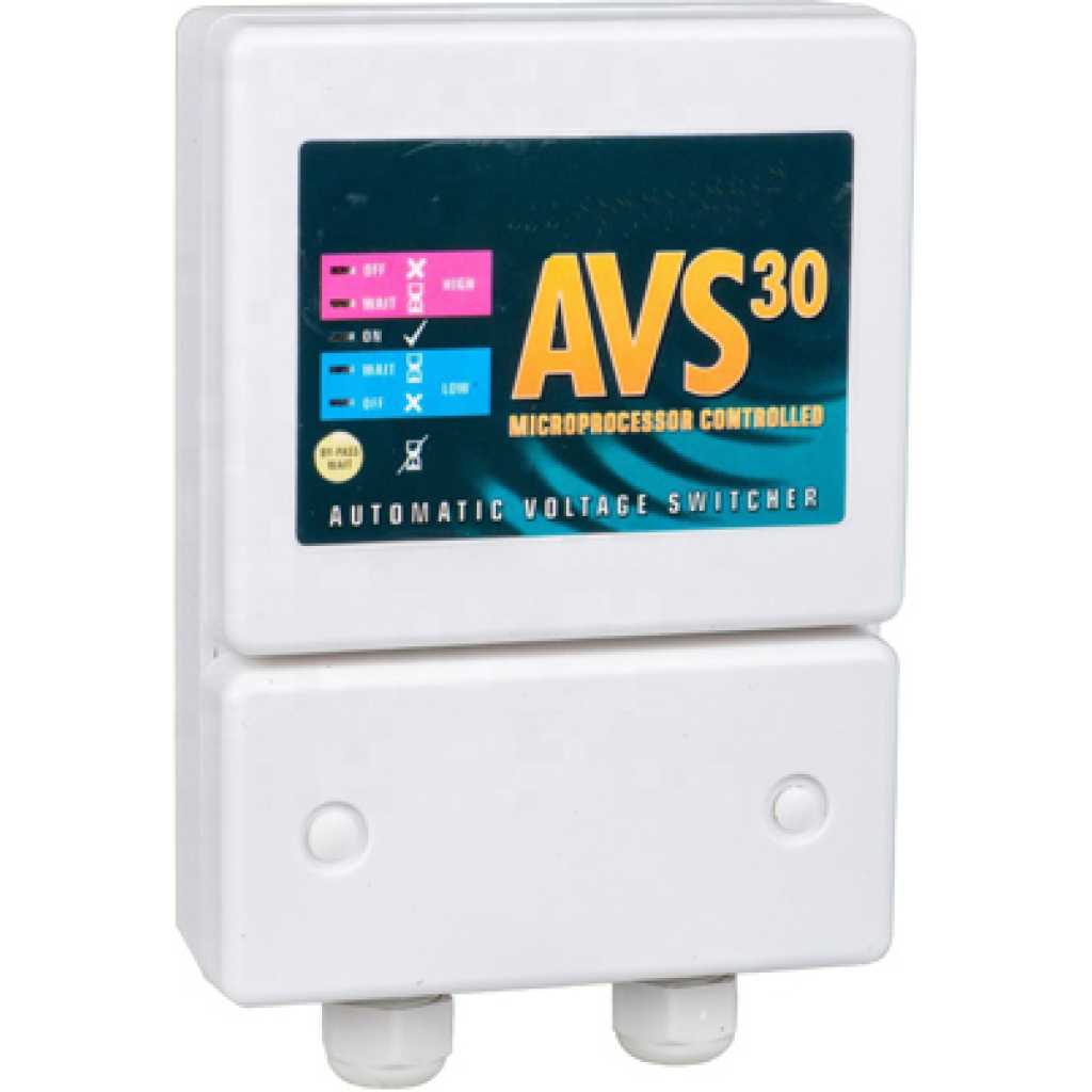 The AVS30 micro is a single phase Automatic Voltage Switcher rated at 30 Amps with a built in microprocessor . The AVS30 will switch off the equipment connected to it if the mains power goes outside pre set limits, and will reconnect automatically when the mains power returns to normal. Reconnection takes place after a time delay, to ensure mains stability. Protects Against: High voltage, low voltage, spike/surges, powerback surges and Loss Of Neutral (LoN) Ideal For: Air conditioners, Large fridge/freezers, whole office, complete circuit Max Power: 30A Wait Time: User adjustable from 10 seconds and 10 minutes