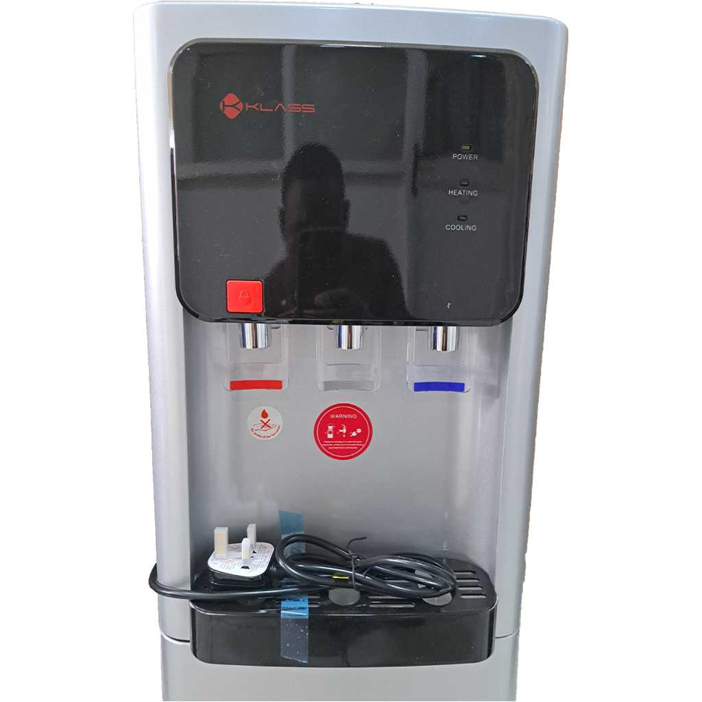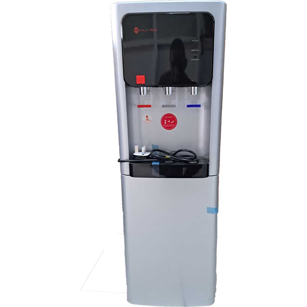 Key Features: KLASS Water Dispenser KL-3TGLC; Hot, Cold & Normal, 3-tap Top Loading With Bottom Fridge – Grey. 3 Faucet provides Hot, Normal & Cold Water Hot Water Child Safety Lock With Refrigerator Cabinet to keep your food safe and preserved This daily home utility appliance comes with a compact refrigerator to store food and beverages Anti-bacterial inner tank ensures safe drinking water Supports fast and easy cleaning efficiently Premium quality construction ensures durability Rated Voltage: 220V-240V~ Rated Frequency: 50-60Hz Rated Power: 580W Heating power: 500W Cooling Power: 80W Hot Water: 85-95 degrees Celsius Cold Water: 8-12 degrees Celsius Relative Humidity: <90% Refrigerant: 134a/32g Cooling Current: 0.8A Climate Class: T Child safety lock on hot water spout