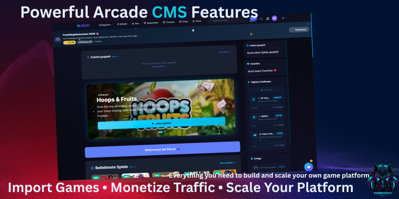 Klikzo – Premium Arcade CMS. Modern PHP arcade CMS with game import, plugins, monetization