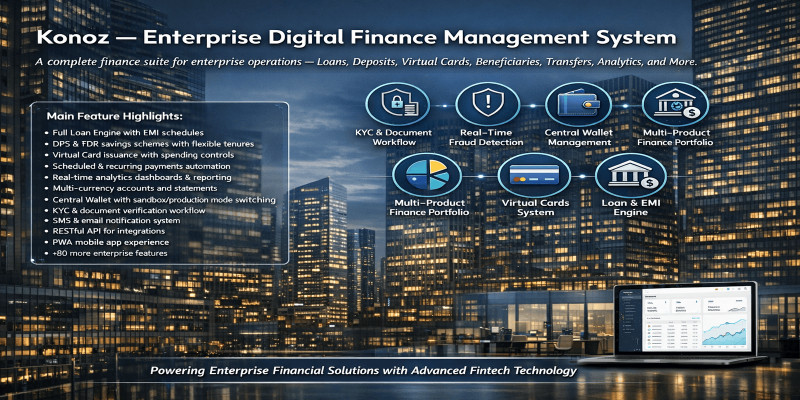 Konoz - Enterprise Digital Finance Management. Enterprise finance management system with accounts, loans, virtual cards, DPS/FDR, KYC verification, and payment integration.