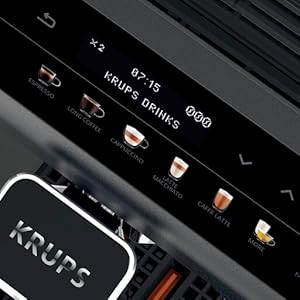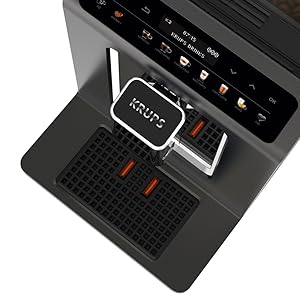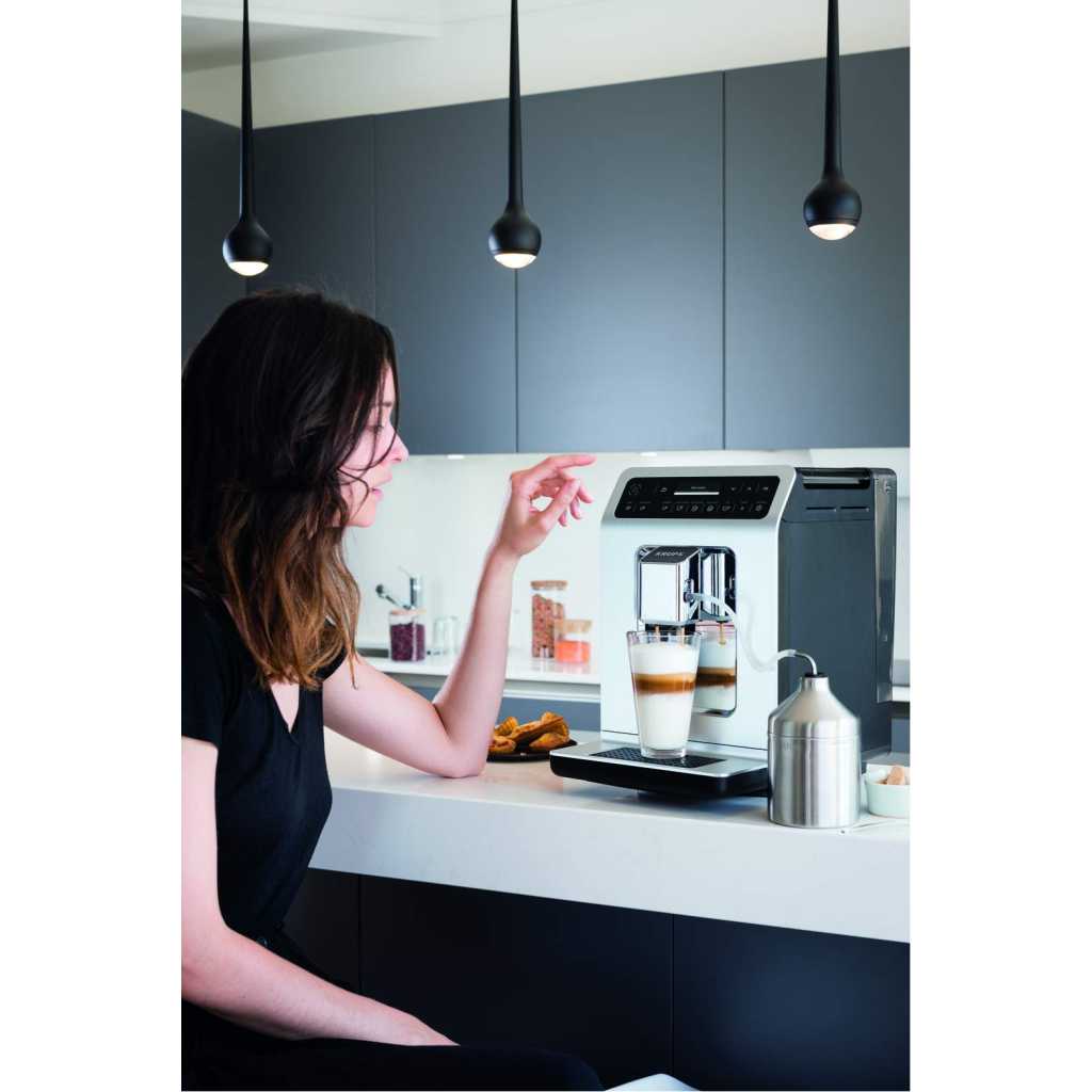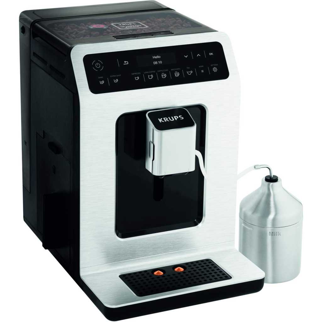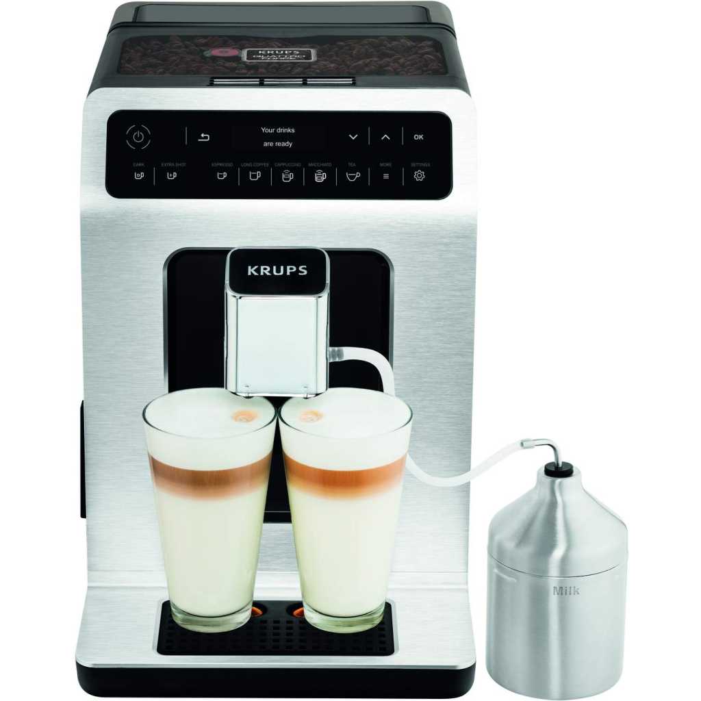 Key Features: KRUPS Evidence Milk EA891D27 Automatic Coffee Machine, Espresso, Cappuccino, 15 Drink Options, Bean to Cup, Tea. Double function lets you prepare two cappuccinos or lattes at once, quickly and easily Stylish espresso machine combines a modern aesthetic with a compact design to fit any kitchen Customisable coffee maker – add an extra shot for a bolder flavour or choose a darker drink for a more robust coffee OLED display and touch controls provide direct access to your drinks for ultimate ease of use