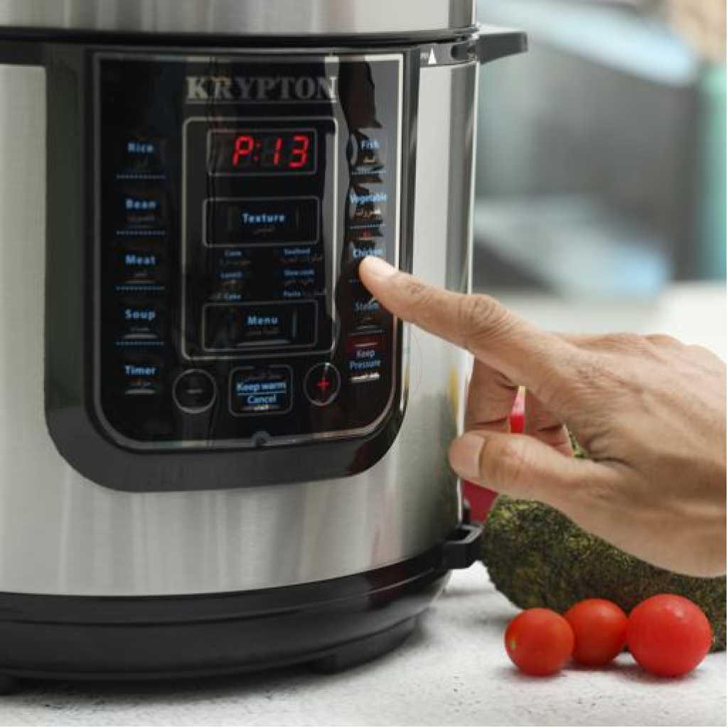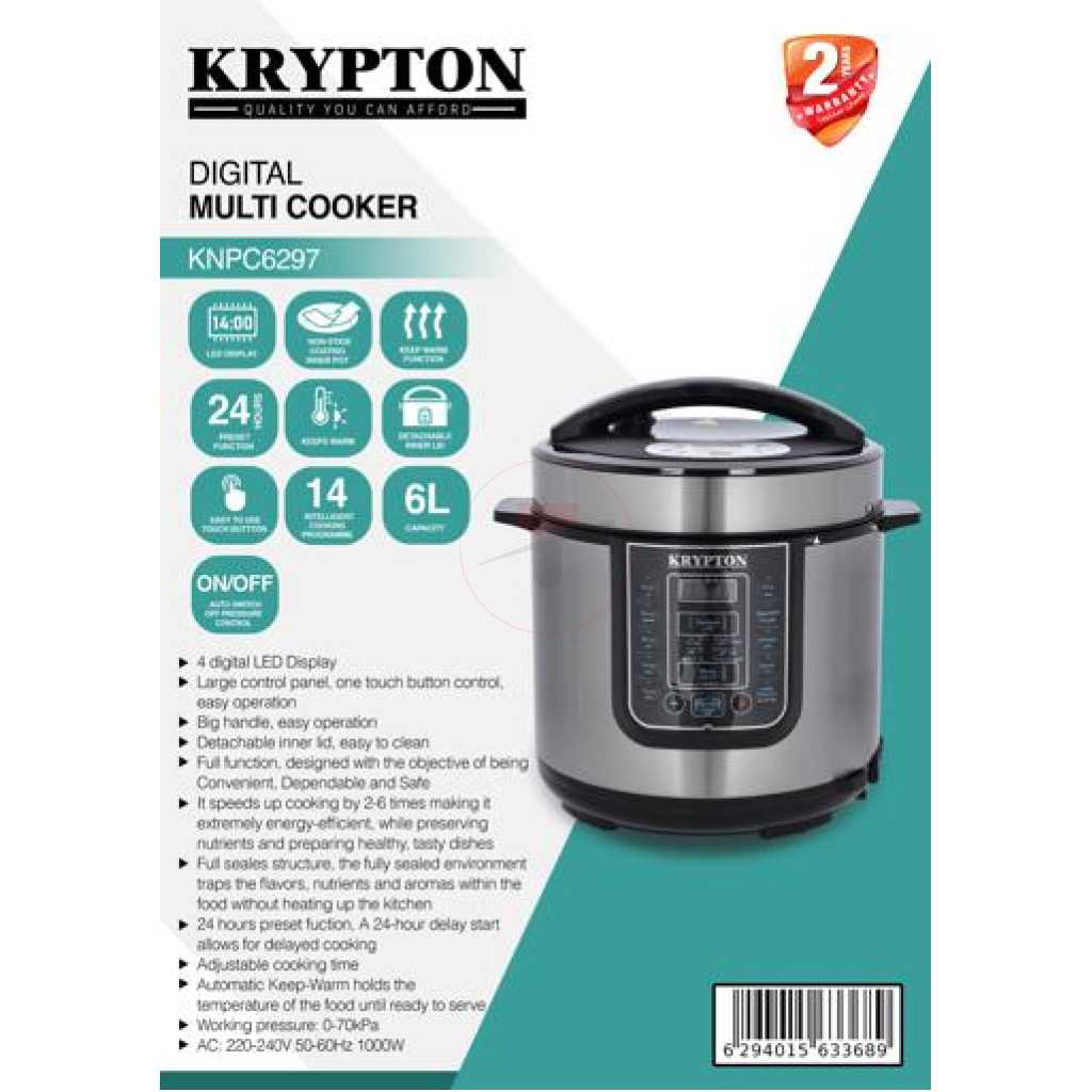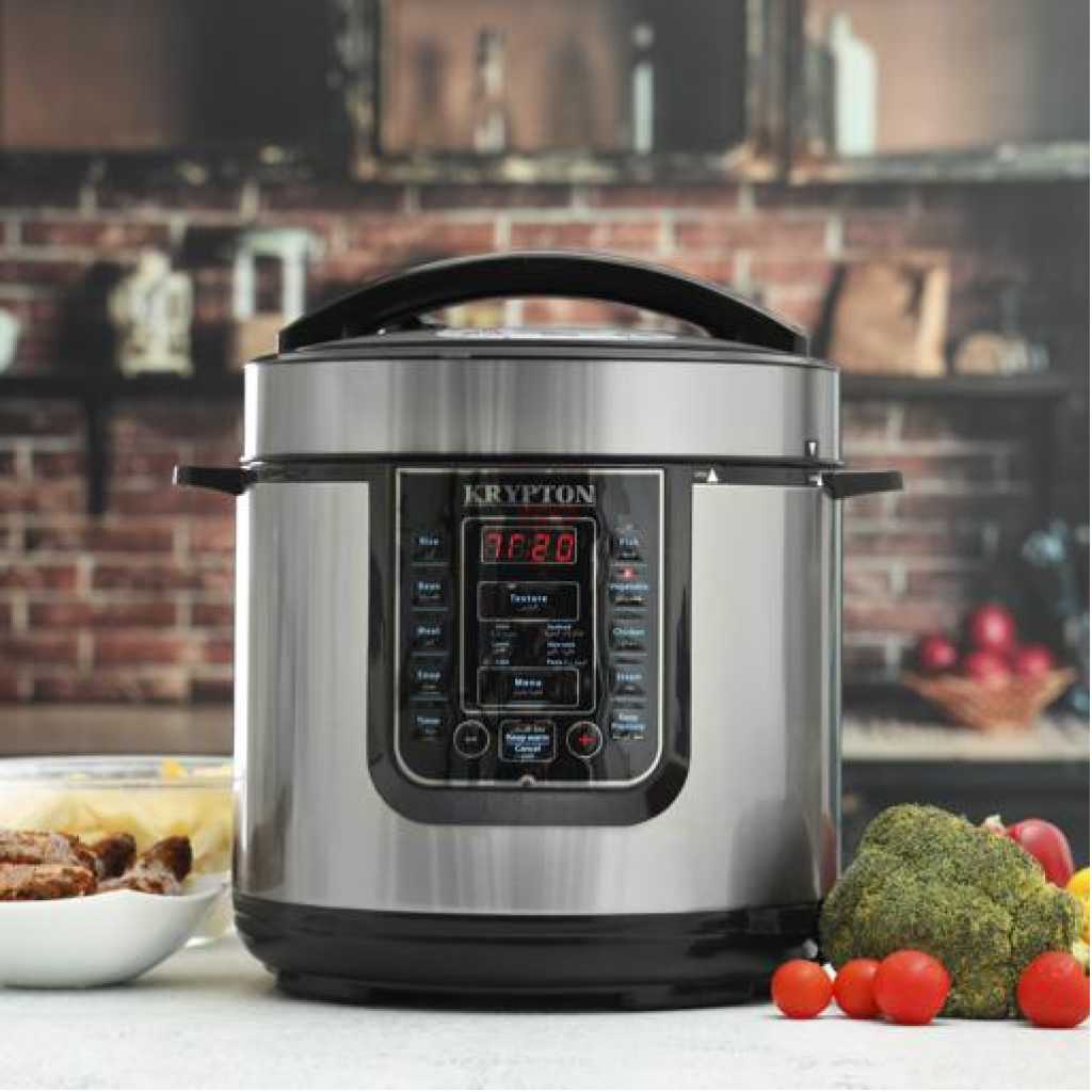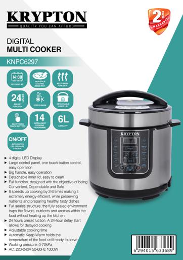 Krypton 6 L Multi-functional Electric Rice, Pressure Cooker KNPC 6297 , Silver it’s convenient cooker’s generous capacity perfectly cooks any variety of rice with specialized functions for both White and Brown Rice. Once the rice has finished, it will automatically switch to Keep-Warm so there’s no need for monitoring or stirring. Unique Sensor Logic Technology uses an on-board micro-computer that ‘thinks’ for itself to automatically optimize cooking temperature to enhance flavor and texture. It Simultaneously Steams Food: Nutritious And Healthy. The Steam Tray allows for healthy steaming of meats and vegetables, even as rice cooks below! Need rice in a pinch? Save time with the Quick Rice function which cuts cooking time by up to 50%. The programmable is great for families on the go, delivering delicious rice ready when it’s needed. And when the cooking is done, the inner cooking pot and all accessories remove for easy cleanup in the dishwasher. Recipe Booklet, Steam Tray, Rice Measuring Cup, Serving Spatula and Soup Ladle included. Key Features: Krypton 6 L Multi-functional Electric Rice, Pressure Cooker KNPC 6297, Silver Multi Function Automatic Cook One touch preset buttons/Automatic. Safe Lock Lid with Steam release/ Non stick Inner Pot. Replaces six common devices: Slow cooker, Canner, Soup Maker, Steamer, Cookware and Rice Cooker. Alumnium inner pot.