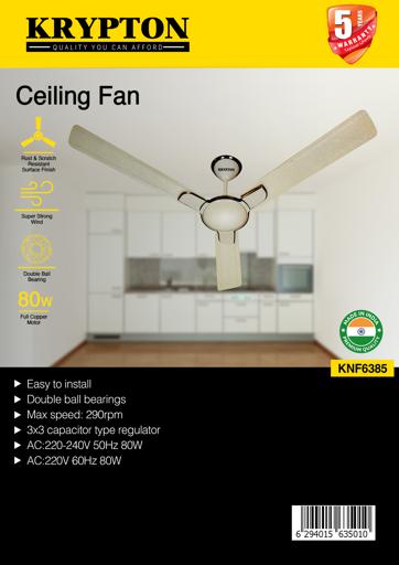 Easy to installDouble ball bearingsMax speed: 290rpm3x3 capacitor type regulatorAC: 220-240V 50/60 Hz 80WPOWERFUL MOTOR - This fan has a dynamic high power 80W motor which will ensure that the blades turn at a high speed to generate cool air quickly. Unlike other fans on the market, this powerful motor sets it apart from other fans as it performs much better and with significantly more power. The powerful motor ensures long life and quality performance. It allows the fan to run smoothly at all speeds while ensuring maximum air delivery. Experience soothing airflow that is perfect for all seasons with this efficient fan.AERODYNAMIC DESIGN - Perfect for the hot summer months, you'll appreciate a fan that moves the air quicker with less noise and effort. Made of lightweight, strong, and durable materials, it is designed with precise aerodynamics.DOUBLE BALL BEARING FOR SMOOTH AND NOISELESS OPERATION - The powerful motor features a double ball bearing design to ensure smooth operation. This efficiency is achieved without producing undesirable noise.COOL AIR DELIVERY - The Krypton Ceiling Fan delivers cool air across your room. It comes with a 3-blade ceiling fan design 290 rpm motor that can deliver air across the room. The wide blades ensure that you feel cool air even in the corners of your room. With a 3x3 capacitor regulator, you can adjust the fan speed according to your need.RUST & SCRATCH RESISTANT SURFACE - This Krypton Ceiling Fan has a visually appealing body that enriches the look of your room. Its body is rust and scratch-resistant which will increase the life span of the fan.