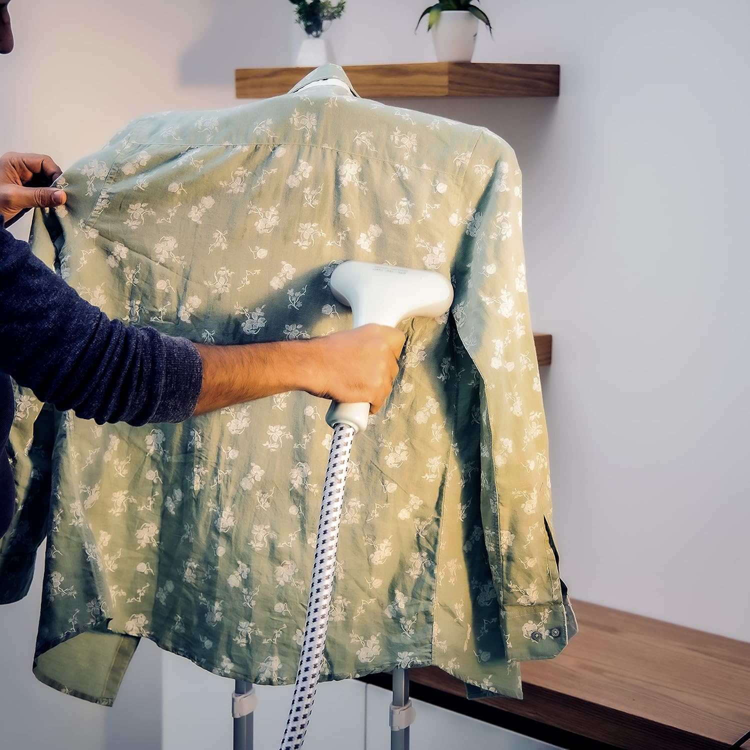 INSTANT HEAT – This Steamer is very easy to use and gives quick functioning to help you in an instant last-minute refresh. After turning it on, the steamer is ready for use in just 45 seconds.HIGH-QUALITY ADJUSTABLE POLES – This item has high-quality double telescopic poles that can be adjusted with ease. You can easily set it according to the garment length. It is durable and suitable for all types of clothes. The poles can be retracted which allows easy storage. It keeps your place neat and tidy.OVERHEAT PROTECTION – This steamer automatically turns off when the heat level is exceeding beyond a certain limit. It saves the appliance and fabric from damage.CLOTH HANGER – Integrated foldable hanger for practical steaming – height adjustable to suit your needs. Lightweight and portable with a modern, ergonomic design.45 SECONDS HEATUP TIME – Ready to use after just 45 seconds – full 1.7L tank delivers 45 minutes of continuous steam. This steamer is safe for use on all kinds of garments, upholstery, and clothes. Key Features: Good quality ADJUSTABLE POLES This item has Good quality double telescopic poles that can be adjusted with ease. You can easily set it according to the garment length. It is durable and suitable for all types of clothes. The poles can be retracted which allows easy storage. It keeps your place neat and tidy. READY IN 45 SECONDS Heats cold water into thick steam in under 45 seconds, eliminates creases, refreshes fabric, reduces bacteria, and vanishes odours. Ideal for all delicate fabric including suits, wedding dresses, silk, saris, dry clean only, curtains, soft furnishing, bedding 1.7 LITER WATER TANK, FAST HEAT UP 45S This garment steamer has a water tank with a large water holding capacity of 1.5liters. It decreases the number of refills to be done and increases your work efficiency. It can blow continuous steam and heats up fast in 45 seconds. OVERHEAT PROTECTION This steamer automatically turns off when the heat level is exceeding beyond a certain limit. It saves the appliance and fabric from damage. It is recommended to do an immediate refill or turn the device off when the water is running low. Not doing so might decrease the appliance’s lifespan and affect its performance. 50 MINUTES CONTINUOUS STEAM Intensely concentrated steam effectively loosens stubborn creases, and gently refreshes garments with less effort than traditional ironing ideal for difficult to iron items and delicate garments that can’t be washed or pressed. With continuous 50 minutes steam, it helps to soften the cloth and remove the creases and wrinkles to give it a fresh and crisp look. The fabric gets a smooth look in no time, no ironing required.