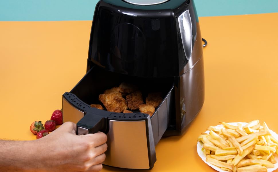 Key Features: GOOD QUALITY LARGE CAPACITY – Our large air fryer with 3.5 liters of cooking capacity so you can easily cook enough healthy low-fat food to feed a small family using little to no oil. TOUCHSCREEN LCD DISPLAY, DOUBLE PROTECTION – It has a touchscreen LCD display that lets you set the timer and temperature and also tells the progress of the food being fried. It has double protection layers for ensuring safety. Cook various food items in it including but not limited to fries, chicken, sausages, gammon, and more. 3.5L NON-STICK BASKET WITH LFGB & FDA – This air fryer has a large capacity basket of 3.5L. The basket is made entirely from non-stick material and is gentle on the food. It is LFGB, and FDA passed and safe for your health. EASY CLEAN – Fully detachable fry basket allows for easy cleaning and is completely dishwasher safe! So, you can fry, grill, bake, and roast healthy oil-free food for your whole family. 7 PROGRAM PRESETS – French fries, meat, drumsticks, steak, cake, shrimp, fish, chicken, and vegetables. Just choose your preset with 1 easy tap on the display and you’re ready to cook. You can also set cooking temp/time.