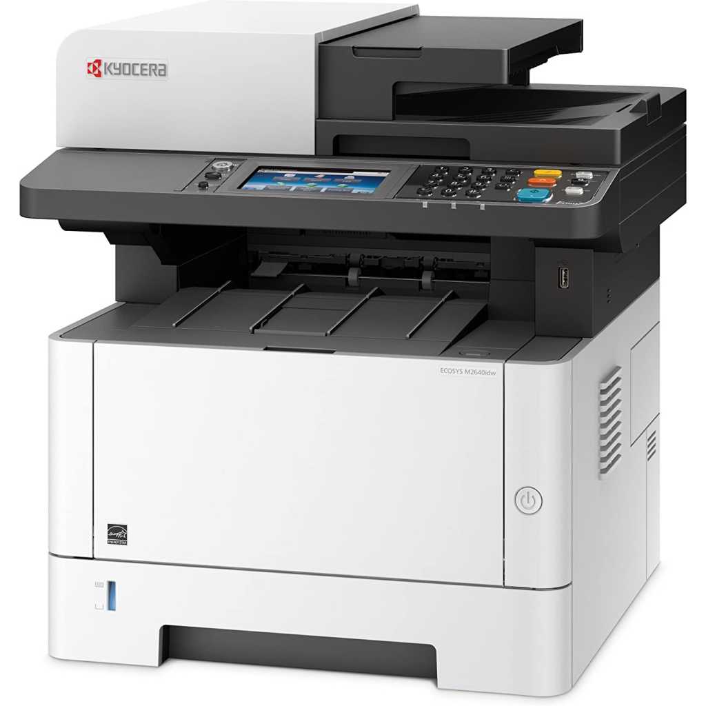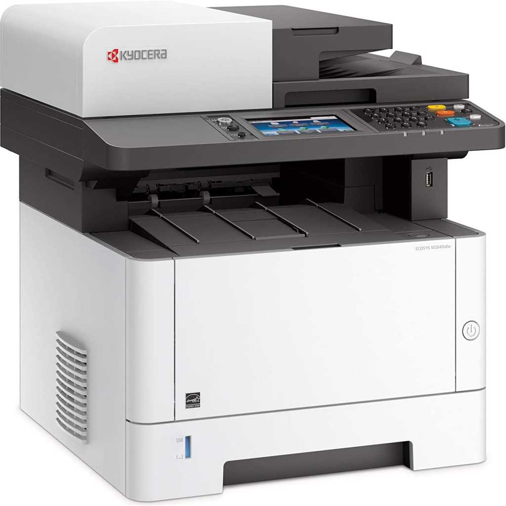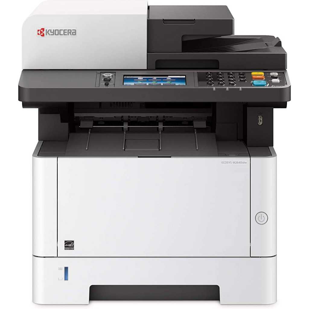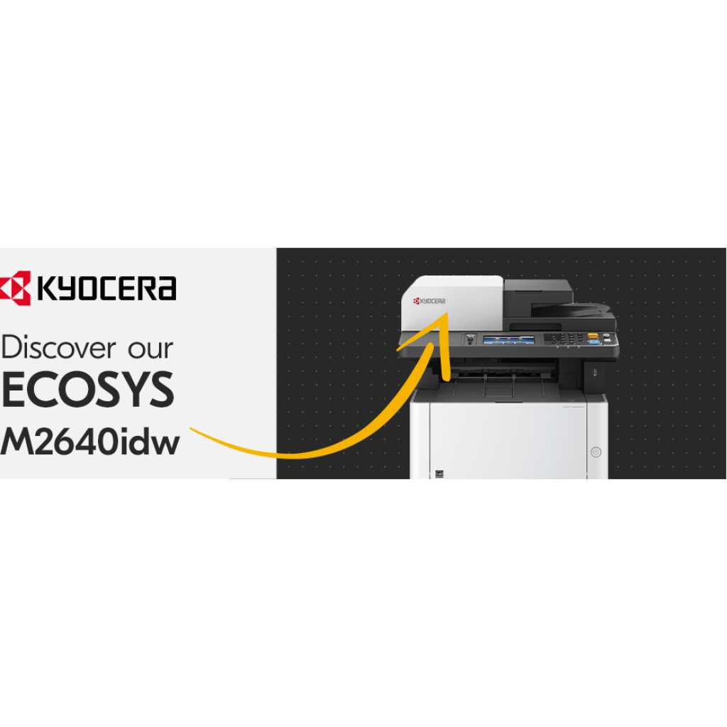 Kyocera M2640idw Monochrome Multifunctional Laser Printer (Print, Copy, Color Scan, and Fax), 52 PPM B&W, Print Resolution 600 x 600 DPI Up To Fine 1200 DPI, Wireless (HyPAS capable). ECOSYS M2640idw Monochrome MFP The perfect printer for your personal workspace Kyocera’s versatile ECOSYS M2640idw is the ideal multifunctional printer for today’s professionals. It is the perfect combination of outstanding reliability, superb output quality, and user-friendliness. This compact device is suited to all personal workspaces, whether in the office or remote locations. Moreover, with lightning print and scan speeds and mobile capabilities, the M2640idw is tailor-made for the new age of work. How can the Kyocera ECOSYS M2640idw help you? Print Enjoy up to 42 pages of high-quality A4 business output per minute in black & white with 600 x 600 dpi print resolution. With an intuitive user interface, this device is easy to use from the get-go – it’s professional printing made simple. Copy With Quick Copy functionality options and high copy speeds, the ECOSYS M2640idw saves you valuable time when it comes to making copies of documents when on the go. That’s one less thing to worry about. Scan The ECOSYS M2640idw provides users with up to 40 ipm simplex, 32 ipm duplex monochrome and color scanning. With scan to folder, e-mail, and USB options, you get greater versatility when it comes to sharing documents. Why the Kyocera ECOSYS M2640idw? ECOSYS Technology Kyocera’s famous ECOSYS technology combines long-life parts with reduced TEC values and a reduction of up to 85% in energy usage. It’s outstanding productivity with reduced energy bills. Choose Kyocera Kyocera’s combination of industry expertise, outstanding professionals, and groundbreaking technologies make it the ideal partner for workspaces seeking to add a new dimension to how they work. Quality that lasts At Kyocera, we are passionate about using our technology to deliver sustainable solutions and products that last the test of time. The ECOSYS M2040dn brings all these elements together – and then some! PRODUCT INFORMATION