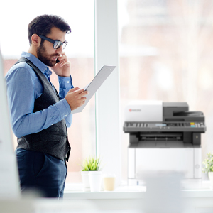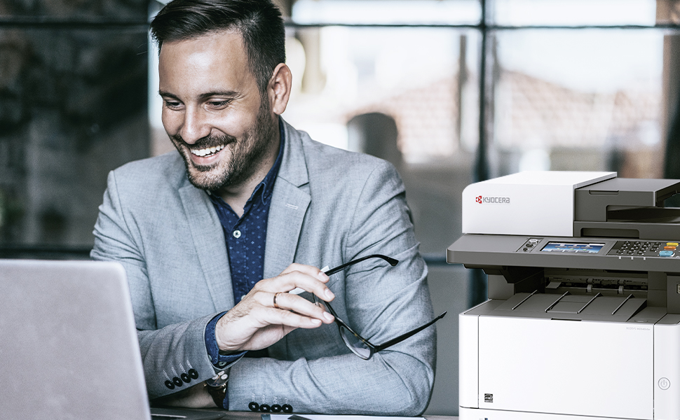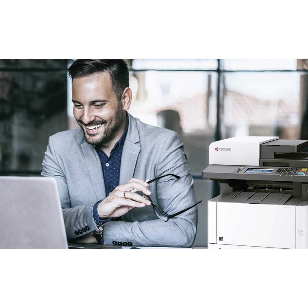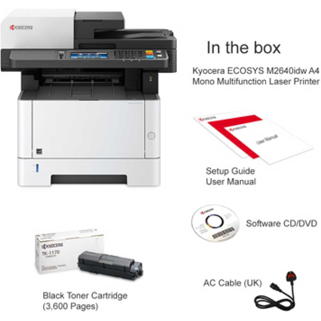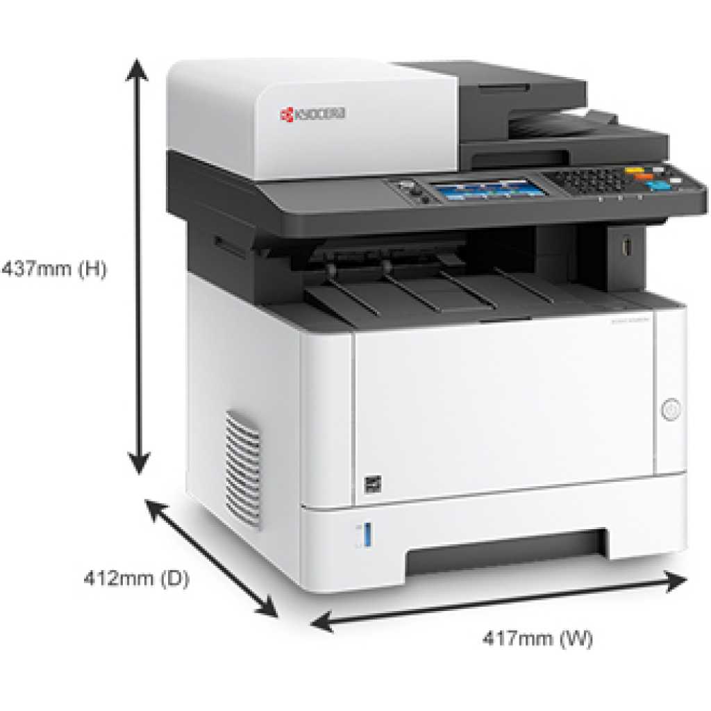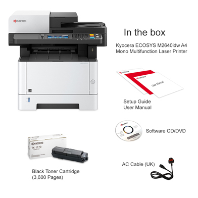 Kyocera M2640idw Monochrome Multifunctional Laser Printer (Print, Copy, Color Scan, and Fax), 52 PPM B&W, Print Resolution 600 x 600 DPI Up To Fine 1200 DPI, Wireless (HyPAS capable). ECOSYS M2640idw Monochrome MFP The perfect printer for your personal workspace Kyocera’s versatile ECOSYS M2640idw is the ideal multifunctional printer for today’s professionals. It is the perfect combination of outstanding reliability, superb output quality, and user-friendliness. This compact device is suited to all personal workspaces, whether in the office or remote locations. Moreover, with lightning print and scan speeds and mobile capabilities, the M2640idw is tailor-made for the new age of work. How can the Kyocera ECOSYS M2640idw help you? Print Enjoy up to 42 pages of high-quality A4 business output per minute in black & white with 600 x 600 dpi print resolution. With an intuitive user interface, this device is easy to use from the get-go – it’s professional printing made simple. Copy With Quick Copy functionality options and high copy speeds, the ECOSYS M2640idw saves you valuable time when it comes to making copies of documents when on the go. That’s one less thing to worry about. Scan The ECOSYS M2640idw provides users with up to 40 ipm simplex, 32 ipm duplex monochrome and color scanning. With scan to folder, e-mail, and USB options, you get greater versatility when it comes to sharing documents. Why the Kyocera ECOSYS M2640idw? ECOSYS Technology Kyocera’s famous ECOSYS technology combines long-life parts with reduced TEC values and a reduction of up to 85% in energy usage. It’s outstanding productivity with reduced energy bills. Choose Kyocera Kyocera’s combination of industry expertise, outstanding professionals, and groundbreaking technologies make it the ideal partner for workspaces seeking to add a new dimension to how they work. Quality that lasts At Kyocera, we are passionate about using our technology to deliver sustainable solutions and products that last the test of time. The ECOSYS M2040dn brings all these elements together – and then some! PRODUCT INFORMATION