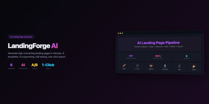 LandingForge AI - Landing Page Generator. Generate high-converting landing pages with AI. 6 templates, AI copywriting pipeline, A/B testing, one-click export. Next.js 14.