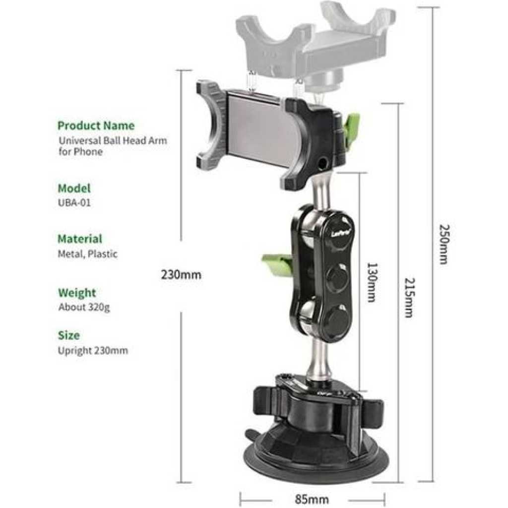 Key Features: LANPARTE UBA-01L Car Suction Cup Mount Extended Bracket Multi Angle Adjustable Phone Holder 【Versatile Mounting】LanParte UBA-01L universal car suction cup mount adapts to various vehicles, offering flexible positioning for your devices. 【Multi-Angle Shooting】Adjustable arm allows for diverse shooting angles, perfect for capturing scenic drives or creating professional-looking content on the go. 【Secure Suction Cup】Strong suction cup design ensures stable attachment to your car’s dashboard or windshield for worry-free use while driving. 【Extended Reach】With a height of 37cm, this extended version provides ample reach for optimal device positioning in your vehicle. 【Durable Construction】Made from a combination of silicone, ABS plastic, and aluminum alloy, ensuring longevity and resistance to daily wear and tear. Specifications: Item No.: UBA-01L Applicable car brands: Universal Installation method: Suction cup Clamping size: 6.5-8cm, thickness within 1cm, height: 37cm Product material: Silicone, ABS, aluminum alloy
