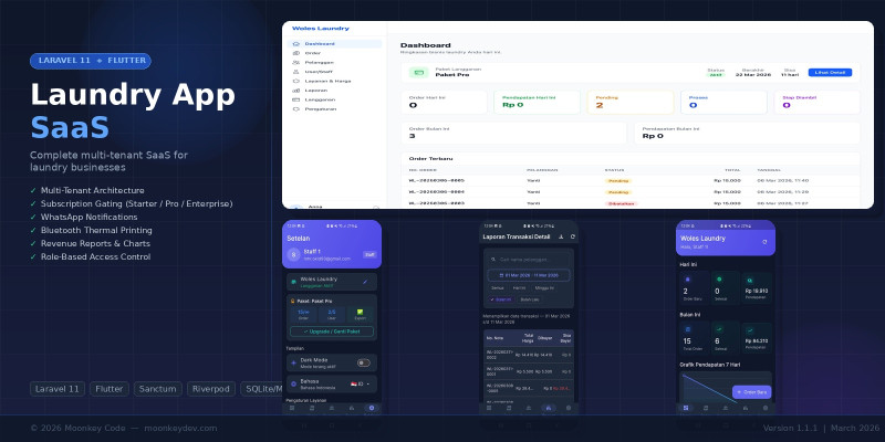 Laundry App SaaS - Laravel And Flutter . Full-stack SaaS for laundry businesses. Laravel 11 REST API + Web Admin Dashboard and Flutter Mobile/Web app, Multi-tenant.
