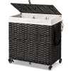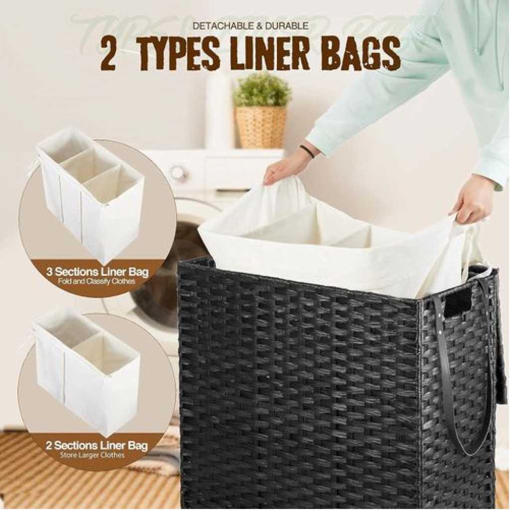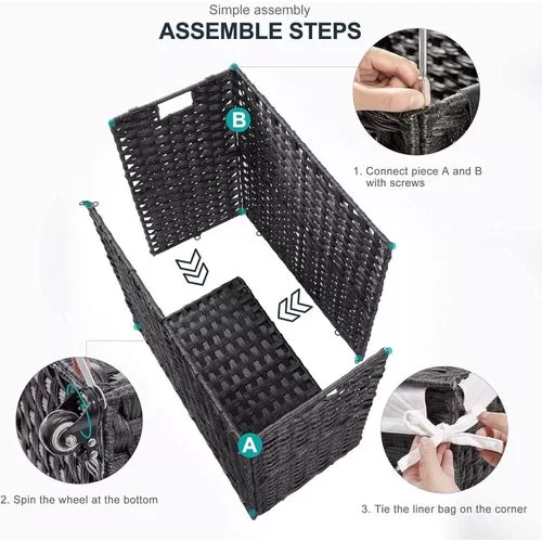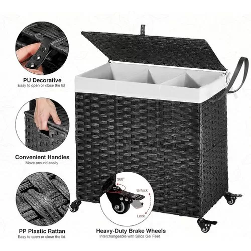 Handwoven Craftsmanship – Greenstell laundry hampers with wheels are made of durable synthetic rattan materials that are waterproof. The laundry basket with lid is made by professional craftsman, and each piece is unique, so there are subtle differences. Waterproof and adjustable foot pads are added to prevent the clothes from touching the floor. Bright natural veneers and delicate weaving, work well with any style of furniture design, lightweight and durable Wide Inner Space – 2 types of liner bag of different specifications – 2-section liner bag can hold larger pieces and more clothes in each grid, 3-section liner bag can easily sort clothes of different colors. The thickened wire frame on the laundry basket improves load bearing capacity and leaves more space inside. Added PU decorative handles, make it easy to open the hamper lid to put the dirty clothes into the basket, keeping your room tidy and clean Detachable and Washable Linings & Mesh Bags – Each laundry hamper with lid is equipped with 2 detachable liner bags, so the clothes can be conveniently taken out from the basket and transported to the washing machine. The 2 liner bags are convenient to move, wash and replace. The hamper lid hides the smelly clothes while keeping the dirty clothes invisible. 5 mesh laundry bags make washing easier and cleaner, which are suitable for bath towels, coats, jeans, underwear, socks and so on Home Companion – The liner bags are made of high-quality stitching process. Put the liner bag into the basket and support its top and make it open to reverse basket . The back lining strap is tied to the basket to prevent it from falling. It can easily hold up to 125L of clothing, making storage of clothing easy and relax. Clothes are easily separated with 5 mesh laundry bags, which can easily solve the problem Easy to assemble, large capacity – Convenient tools are equipped for easy installation. Large capacity 125L size: 25.6 (L) x 13.0 (W) x 25.2 (H) in. The laundry basket with double-sided Inscribed handle can easily move blankets, towels or daily clothes among different rooms. The maximum load capacity is 110LB