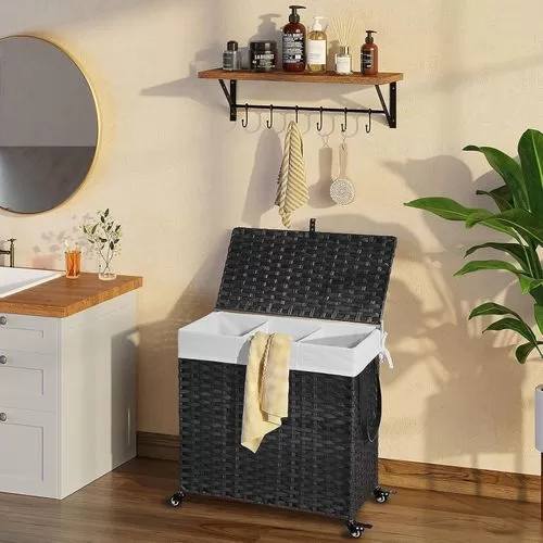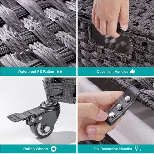 Key Features: Handwoven Craftsmanship – Greenstell laundry hampers with wheels are made of durable synthetic rattan materials that are waterproof. The laundry basket with lid is made by professional craftsman, and each piece is unique, so there are subtle differences. Waterproof and adjustable foot pads are added to prevent the clothes from touching the floor. Bright natural veneers and delicate weaving, work well with any style of furniture design, lightweight and durable Wide Inner Space – 2 types of liner bag of different specifications – 2-section liner bag can hold larger pieces and more clothes in each grid, 3-section liner bag can easily sort clothes of different colors. The thickened wire frame on the laundry basket improves load bearing capacity and leaves more space inside. Added PU decorative handles, make it easy to open the hamper lid to put the dirty clothes into the basket, keeping your room tidy and clean Detachable and Washable Linings & Mesh Bags – Each laundry hamper with lid is equipped with 2 detachable liner bags, so the clothes can be conveniently taken out from the basket and transported to the washing machine. The 2 liner bags are convenient to move, wash and replace. The hamper lid hides the smelly clothes while keeping the dirty clothes invisible. 5 mesh laundry bags make washing easier and cleaner, which are suitable for bath towels, coats, jeans, underwear, socks and so on Home Companion – The liner bags are made of high-quality stitching process. Put the liner bag into the basket and support its top and make it open to reverse basket . The back lining strap is tied to the basket to prevent it from falling. It can easily hold up to 125L of clothing, making storage of clothing easy and relax. Clothes are easily separated with 5 mesh laundry bags, which can easily solve the problem Easy to assemble, large capacity – Convenient tools are equipped for easy installation. Large capacity 125L size: 25.6 (L) x 13.0 (W) x 25.2 (H) in. The laundry basket with double-sided Inscribed handle can easily move blankets, towels or daily clothes among different rooms. The maximum load capacity is 110LB