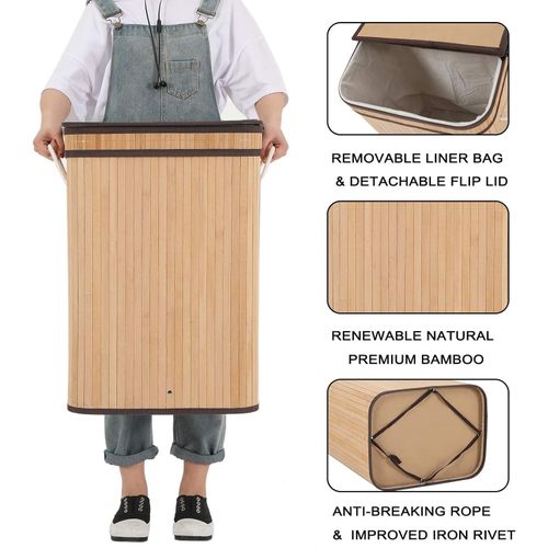 Laundry Hamper with Lid, 72L Bamboo Laundry Basket with Removable Liner, Collapsible Storage. Bamboo Laundry Hamper By using a renewable material like bamboo in this product, we avoid using plastic or finite materials. Nature designs for assembly, reuse, and recycling. Whether you’re single, married, a parent, or a pet owner, laundry is a natural part of your everyday life. So keep your space tidy and your dirty clothes out of sight, or give the routine a hint of vitality and your home a hearty dose of style with Sophia & William laundry hampers and baskets. Removable Flip Lid The flip lid keeps smells away and dirty laundry out of sight. The removable and large opening design makes it more convenient for laundry. Sturdy Rope Handles Equipped with ergonomic dual rope handles for easy portability. Lift the lightweight basket and tote your laundry away. Premium Bamboo Removable Flip Lid Easy Lift-Out Liner Dual Rope Handles Space-Saving Foldable Design