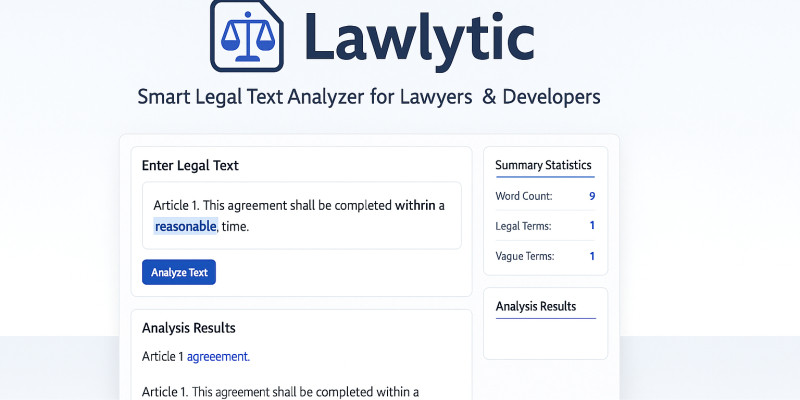 Lawlytic - Legal Text Analyzer PHP Script. Analyze contracts and legal documents instantly. Detect legal terms, vague phrases, and article numbers automatically.