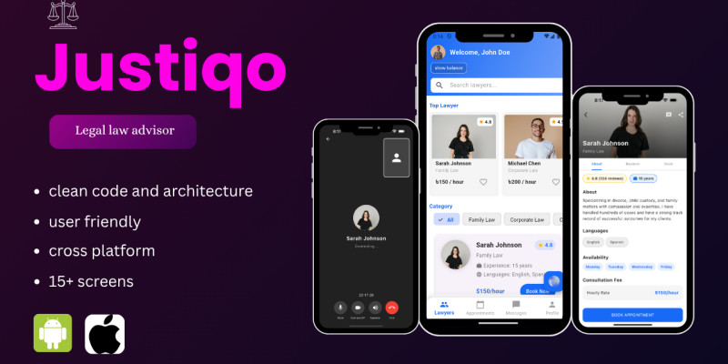 Lawyer advisor App Flutter UI . Modern lawyer appointment app UI with OTP login, balance, booking, chat, call, AI help, profile, and categorized listings.