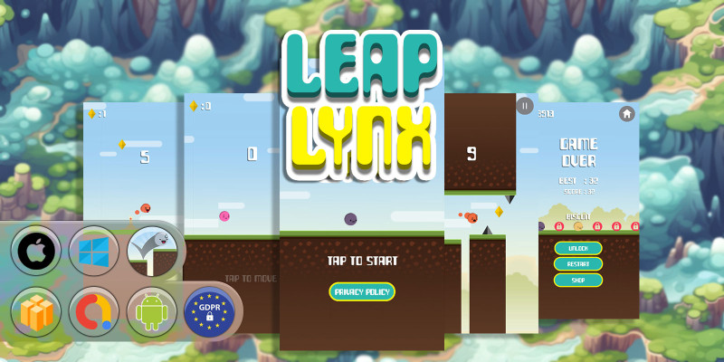 Leap Lynx - Buildbox Template. Leap through obstacles, collect diamonds and gems, and unlock multiple characters in this endless arcade game.