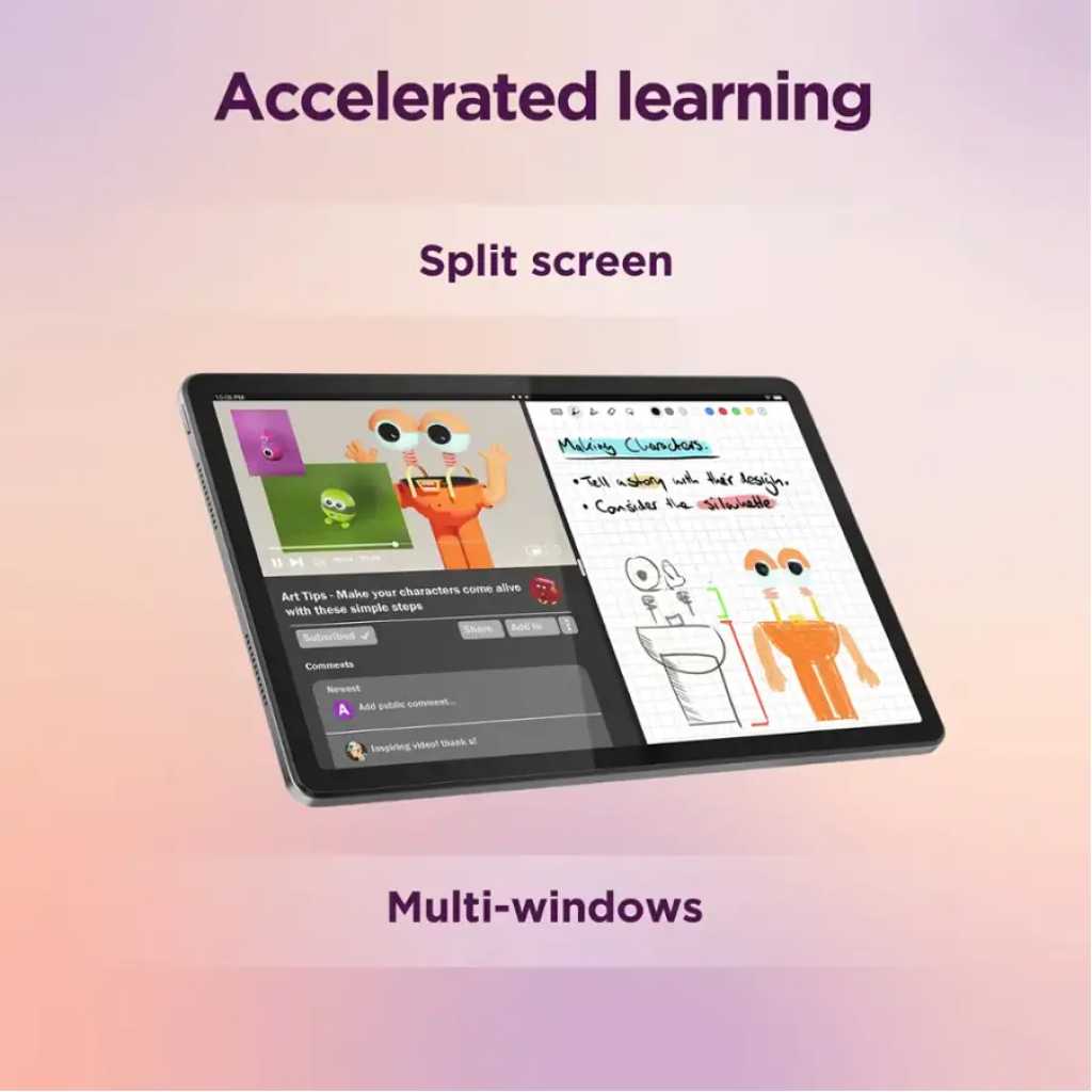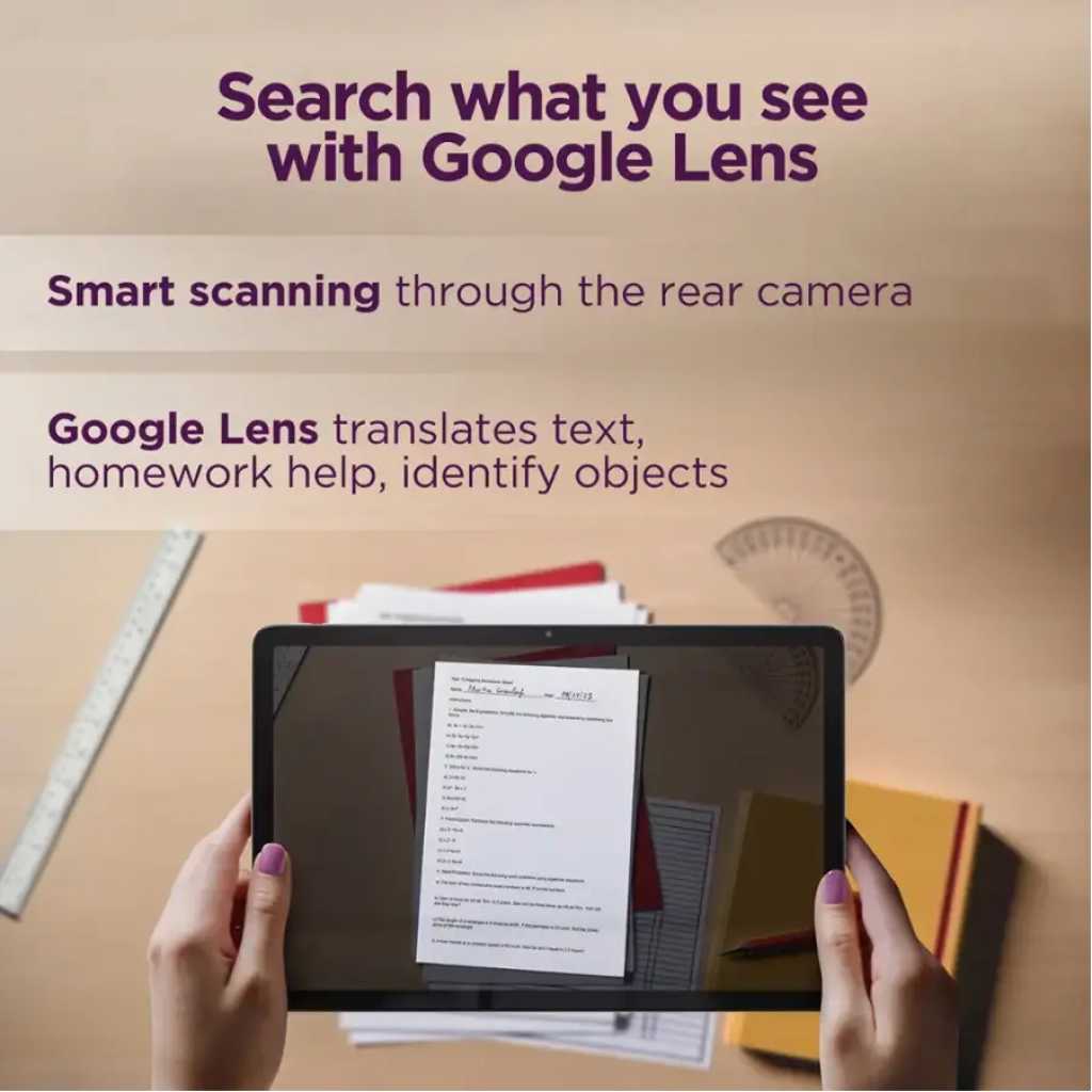 Vivid Play 11″, 1920x 1200, 90Hz, Netflix HD certified, Quad speakers with Dolby Atmos Learn Smarter Compatible Lenovo Tab Pen for note-taking, drawing, and more. Explore smarter on Nebo, MyScript Calculator 2 and other favorite inking apps with the Lenovo Tab Pen Up To Speed MediaTek Helio G88 Octa-core with up to 4GB+ 128GB All Day Power 7040 mAh battery, up to 10 hours of streaming, up to 15W fast charging Accelerated Learning Unlock multitasking with a split-screen and multi-windows at once. Learn more in less time! Immersive Reading Keep young curious minds focused and eye-safe while reading for hours with Lenovo’s Immersive Reading Mode and TUV eye care certified display. Learn Through The Cameras Facilitate the in-class experience through the 8MP Front camera, and smart document scanning through the rear camera. Search What You See With Google Lens Google Lens lets you search what you see, get stuff done faster, and interact with the world around you. Translate text, get help with homework, or quickly identify products, plants, and places. Seamless Collaboration Boost learning experiences with Lenovo Freestyle – transfer files, cast apps or create PC-like experience with an optional Bluetooth keyboard, effortlessly enabling a smart learning experience. Help Your Kids Discover, Create and Grow Google Kids Space on Lenovo tablets helps children discover, create and grow, recommending content based on their interests. Set boundaries and guide kids to quality content while keeping an eye on their screen time with Family Link parental controls. What’s Included Lenovo Tab M11, USB Type-C 2.0 Charging Cable, 5V/2A Charging Adapter, Quick Start Guide & Safety Warrant, MicroSD Card Pin