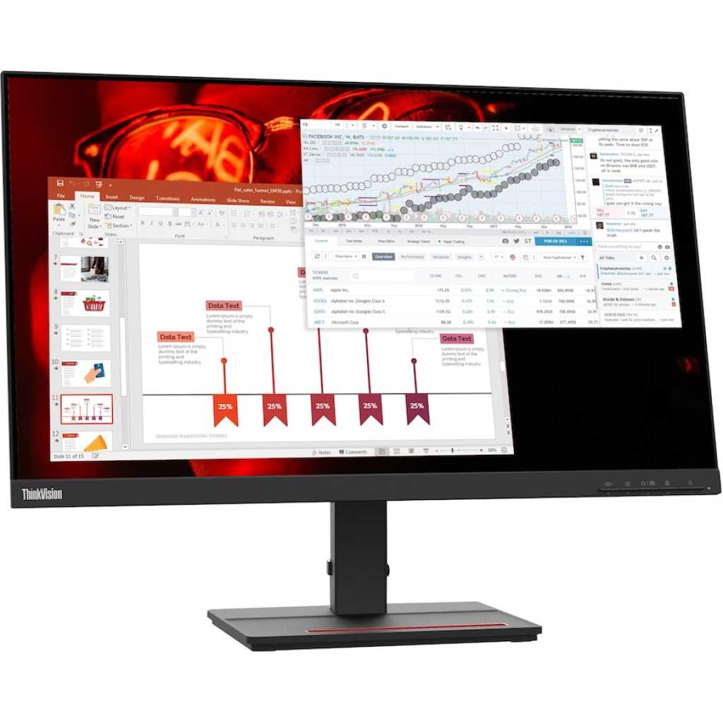 Enter ThinkVision S27e-20. The next generation of this excellent performer. Its 3-side Near Edgeless panel display with ultra-slim bezels makes navigating spreadsheets over two screens an effortless task. The 1920 x 1080 FHD resolution In-Plane Switching panel displays images to everyone, no matter what angle they’re standing or sitting at to the screen with no colour distortion. On the subject of other devices, the S27e-20 offers effortless connection to PCs and laptops through both HDMI and VGA ports, making your presentations, video files and spreadsheets easy to manage and deliver. For quality sound delivery, the monitor outputs to speakers and headphones through an Audio Out port. In addition, all those resulting cables can be hidden away through the stand’s integrated cable management system to keep desks clutter-free. Lenovo ThinkVision S24e Features Thin-Bezel Design Utilizing 0.1″ bezels on three sides, Lenovo’s NearEdgeless design ensures an emphasis on screen space, with a virtually unbroken panorama when using multiple monitors. Choose Your Connection Choose between HDMI and VGA inputs. A 3.5mm audio output port is also present, allowing you to connect a speaker. Want to cut down on clutter? Use the optional Lenovo USB Soundbar Speaker to create a unified solution that maximizes desk space. Copious Colors In addition to 72% coverage of the NTSC and CIE1931 gamuts, this monitor boasts support for 16.7 million colors. Designed for Safety TÜV Rheinland-certified for eye comfort and low blue light, this display is designed to provide a comfortable and safe viewing experience. Key Features: 27″ In-Plane Switching (IPS) Panel HDMI & VGA Inputs 1920 x 1080 Resolution
