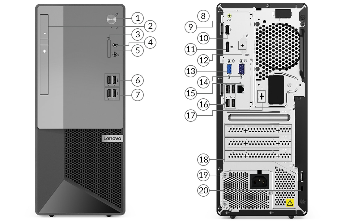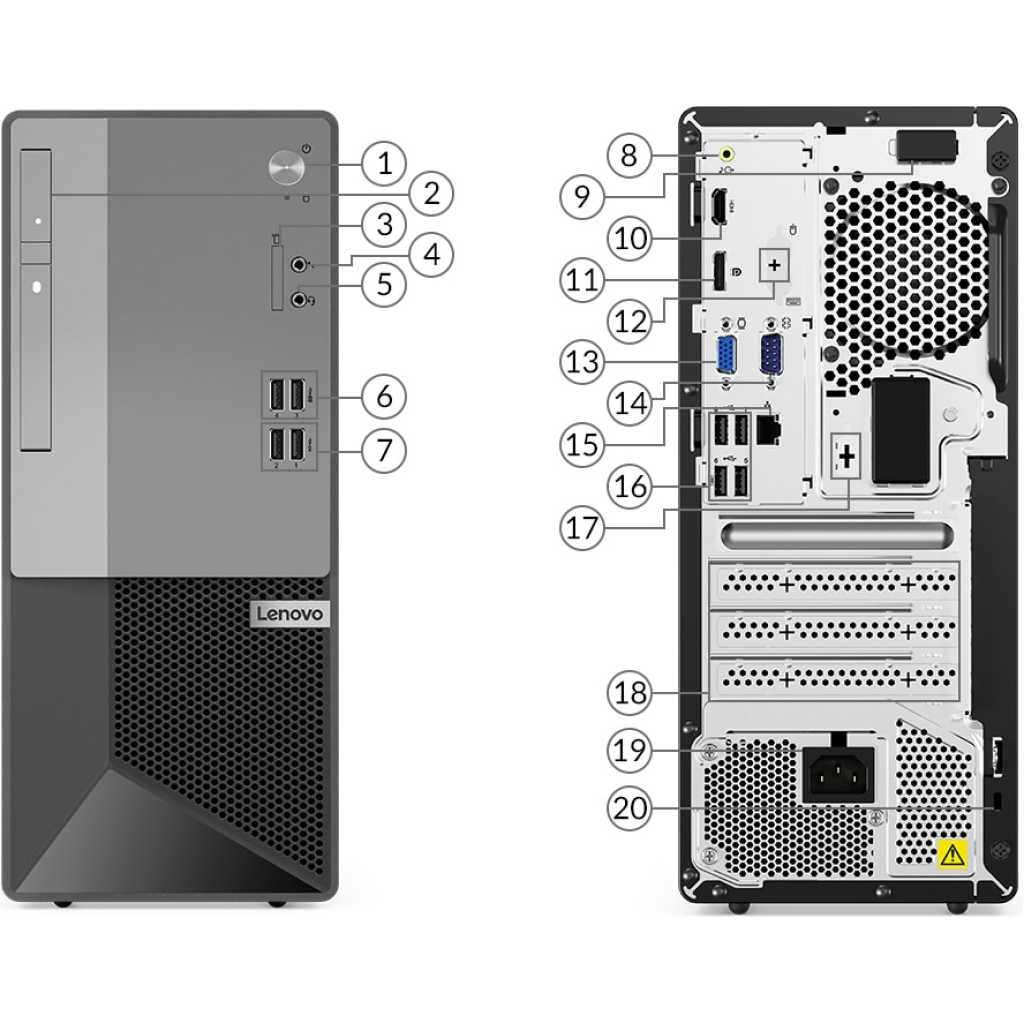 Lenovo V50T Desktop Intel Core i3 4GB RAM 1TB HDD. This stylish 13.6-liter desktop can update any office with a little IT budget. It provides the performance required by your workers to keep up with daily demands thanks to its strong Intel processors, BIOS-based and physical security features, and more effective cooling technologies. Additionally, there are numerous USB connections, including two conveniently located USB 3.2 Gen 1 and Gen 2 connectors at the front, for connecting necessary peripherals. With features like the optional Smart Cable Clip, which locks the cords physically and prevents unauthorized access, the Padlock Loop, which prevents tampering with internal components, and the Kensington lock slot, which guards against device theft, security is prioritized. Select M.2 SSD storage for faster application response times and performance, or HDD storage if you need to store substantial volumes of data. Ports and Slots Available 1Optional: Optical drive 11VGA 2Power button 124 x USB-A 2.0 3SD card reader 13RJ45 ethernet 4Mic 14Optional ports on expansion cards 5Headphone / mic combo 15Power in 62 x USB-A 3.2 Gen 1 16Smart cable clip 72 x USB-A 3.2 Gen 2 17Optional: 2 x PS/2 ports (keyboard / mouse) 8Audio out 18Serial 9HDMI 2.0 19Optional: Serial 10DisplayPort 1.4 20Kensington lock slot. PERFORMANCE Processor Intel Core i3-10100 (4C / 8T, 3.6 / 4.3GHz, 6MB)