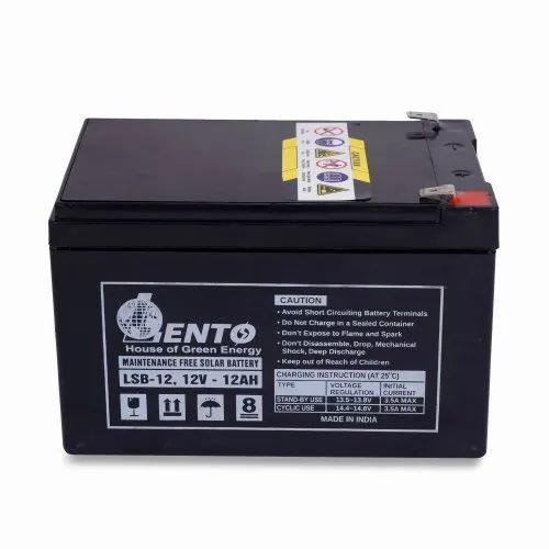 Lento 12AH 12V Solar Battery Sealed Maintenance-free Battery, Made in India. Amp Hours: 12AH Voltage (DC): 12V Positive plate with cyclic grid alloy for higher cycle life. Radial grids for low internal resistance, quick recharge, and high discharge performance. AGM Separator for Greater compression and longer life. Copper alloy screw-type terminals for better electrical conductivity, absolute positive contact, and zero wear & tear. Wide operating temperature range (-20°C to +50°C). Excellent deep discharge capability and ability to withstand frequent and long power failures. Low self-discharge for longer shelf life. High-impact PP/ABS container for better strength Lento Sealed Maintenance-free Batteries are the perfect solution when you want batteries that last for a long time and perform consistently throughout their life. The Lento Battery does not much emit corrosive acidic fumes so it’s safe to install doors. > No leakage, seepage, or spillage of electrolytes. > Can be installed in any application. > Life of the Lento battery is between 3-5 years depending upon the usage. > The self-discharge rate of the Lento battery is very low. Therefore, it has a much longer shelf life. > Available in factory-charged condition, so can be immediately used > Gets charged faster than other batteries due to its special features. Quicker useability for repeated application. Key Features: Lento 12AH 12V Solar Battery Sealed Maintenance-free Battery, Made in India. Amp Hours: 12AH Voltage (DC): 12V Positive plate with cyclic grid alloy for higher cycle life. Radial grids for low internal resistance, quick recharge, and high discharge performance. AGM Separator for Greater compression and longer life. Copper alloy screw-type terminals for better electrical conductivity, absolute positive contact, and zero wear & tear. Wide operating temperature range (-20°C to +50°C). Excellent deep discharge capability and ability to withstand frequent and long power failures. Low self-discharge for longer shelf life. High-impact PP/ABS container for better strength Lento Sealed Maintenance-free Batteries are the perfect solution when you want batteries that last for a long time and perform consistently throughout their life.