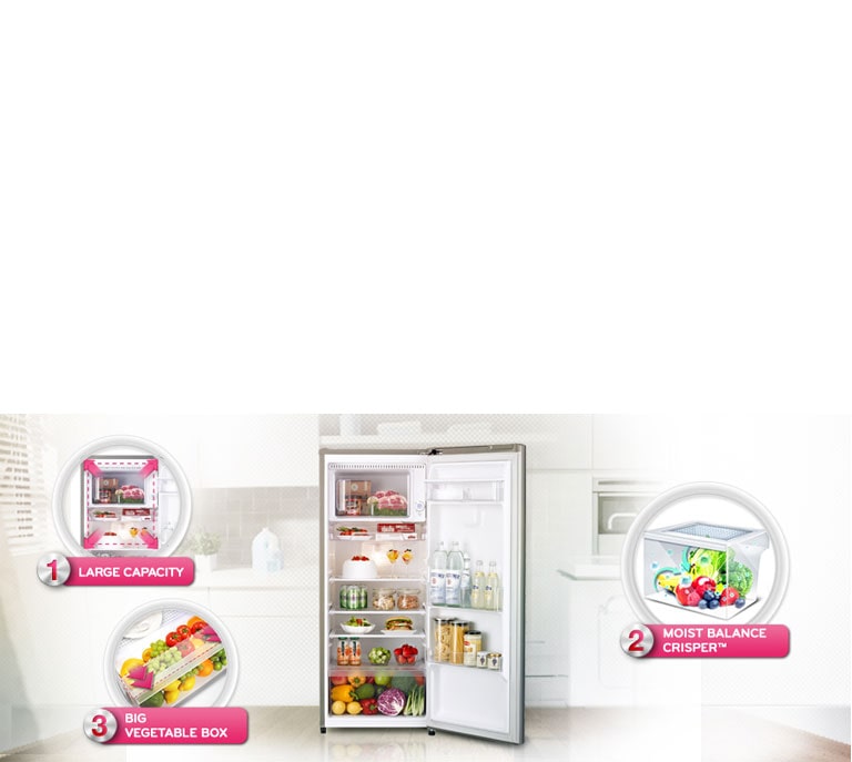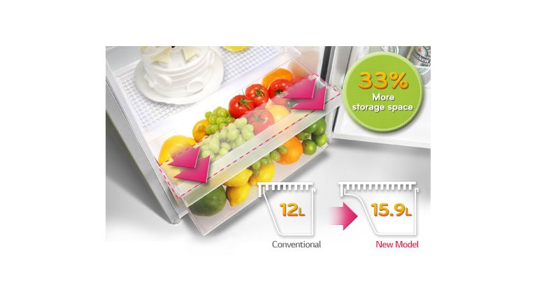 Key Features: Larger Capacity with Same Exterior Size Moist Balance Crisper™ Big Vegetable Box Semi Auto Defrost