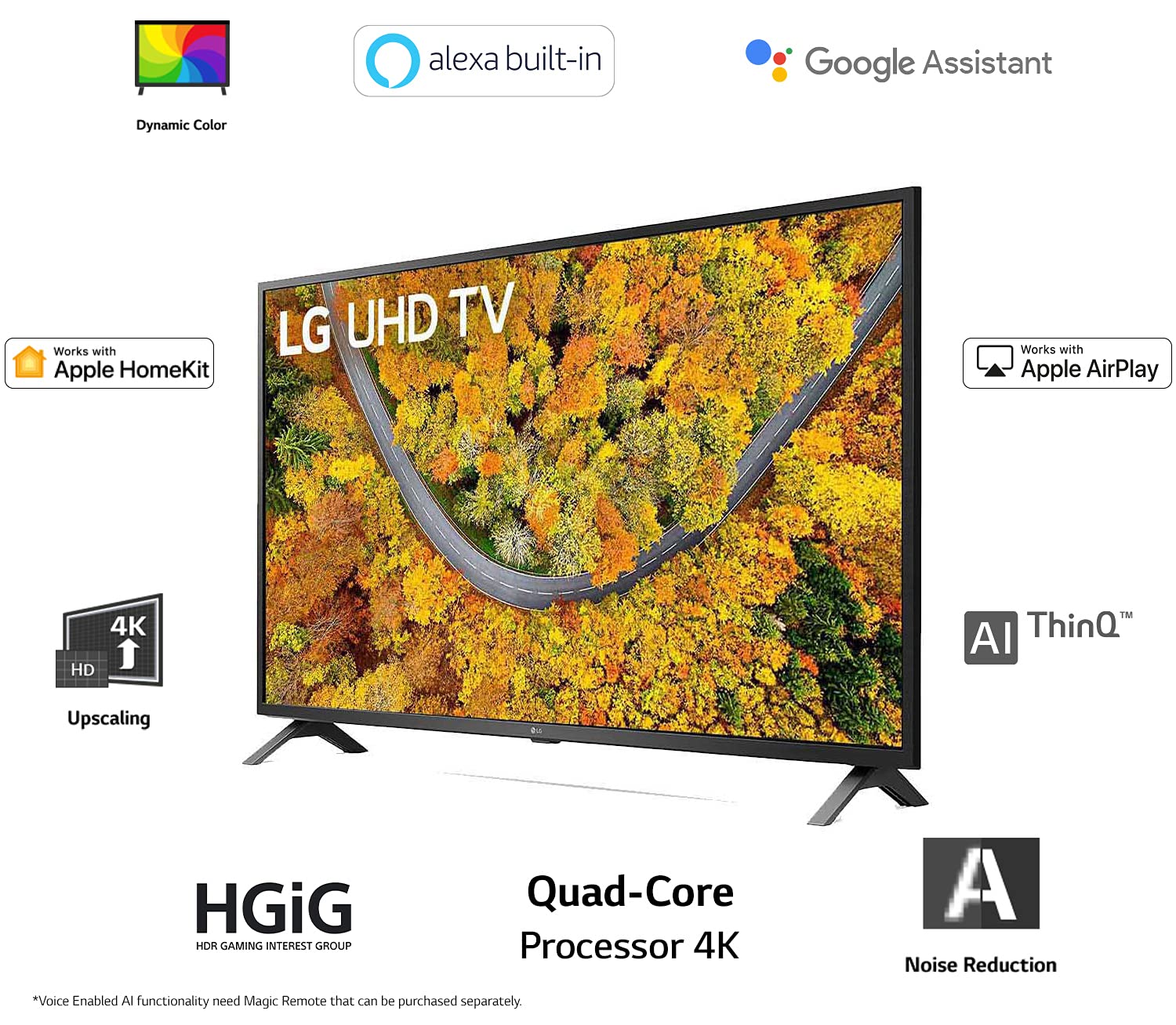 High-Resolution for a razor sharp imageThe higher the resolution, the greater the image detail. LG UHD TV has four times the resolution of a Full HD TVs. It means you are getting 4 times clarity. Consistent images at any angleLG UHD TV maintains more precise color and allows everyoneto enjoy the magnificent picture no matter where they sit. The core of authentic imageQuad core processor works tirelessly to reduce distracting noise, enhance sharpness even while upscaling lower-resolution images to near 4K picture quality. 4K Active HDR for a lifelike sceneHDR(High Dynamic Range) is the new standard for picture quality. It provides delicate detail and lifelike color with wider range of contrast. LG UHD TV supports multi HDR formats including HDR10 Pro and HLG Pro. Multi-channel bringing encapsulating sound effectGreat television deserves great audio. This sound technology creates virtual multi channels which produce the ultra surround effect. Sophisticated inside and outThe stylish frames make the design even more dazzling with its modern taste. Simple ways for your convenienceDiscover a variety of features of smart TV with LG webOS . Go beyond basic control and search to open and navigate select apps and other premium services even using just your voice. DTS Virtua l: X giving extra dimension to soundDTS Virtual: X provides multi-dimensional sound experience. It enables to offer a rich sound using only the built-in speakers of the TV. Key Features: Resolution: 4K Ultra HD (3840×2160) | Refresh Rate: 60 hertz Connectivity: 2 HDMI ports to connect set top box, Blu Ray players, gaming console | 1 USB ports to connect hard drives and other USB devices Sound: 20 Watts Output | 2.0 Ch Speaker | AI Sound Smart TV Features: WebOS Smart TV | AI ThinQ, Built-in Google Assistant & Alexa | Apple Airplay 2 & Homekit | Unlimited OTT App Support: Netflix, Prime Video, Disney+ Hotstar, Apple TV, SonyLIV, Discovery+, Zee5, Voot, Google Play Movies & TV, YuppTV, Youtube, Eros Now Display: 4K Ultra HD LED Display | Slim Design | Quad Core Processor 4K Warranty Information: 3 years comprehensive warranty provided by the manufacture from the date of purchase (Offer Valid till 30th Nov’2021) Easy returns: This product is eligible for replacement within 10 days of delivery in case of any product defects, damage or features not matching the description provided