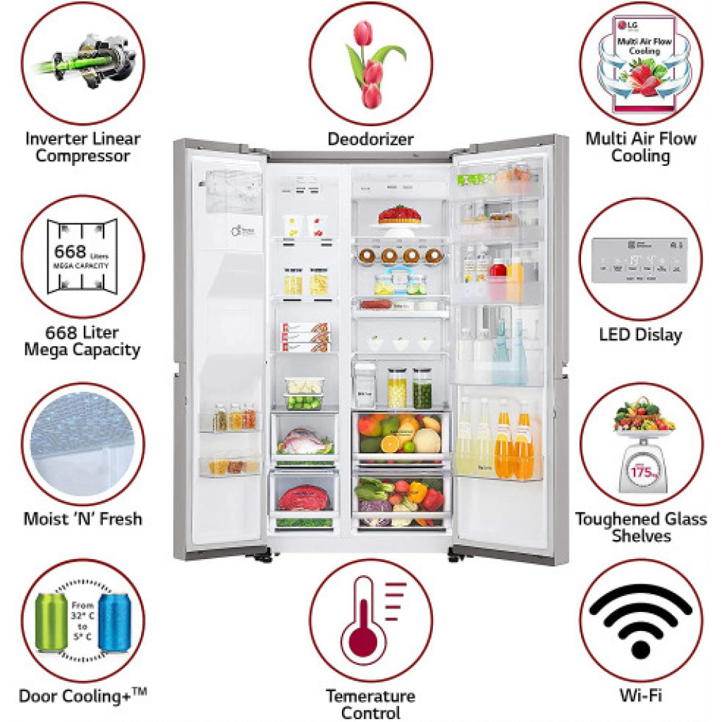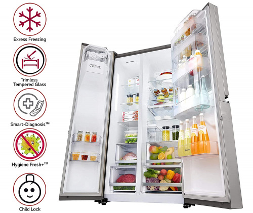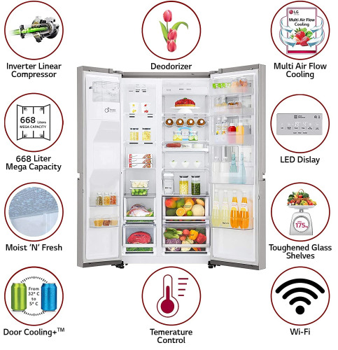 From the manufacturer Key Features: Side by Side Frost Free Refrigerator less than sub-Type: Side by Side Frost-Free Refrigerators: Premium refrigerators with auto-defrost function to prevent ice build-up Capacity 668 L: Suitable for families with 5 or more members Warranty: 1 year on product, 10 years on compressor Shelf Type: Toughened Glass Also included in the box: User manual, Warranty card InstaView Door-in-Door has a sleek mirrored glass panel that illuminates with two quick knocks, Easy Access to your Favorites, 668 Litres of Storage Space, Non-plumbed Water & Ice Dispenser