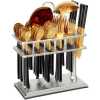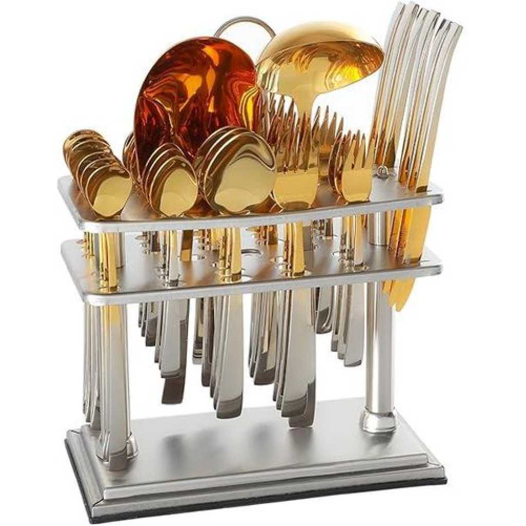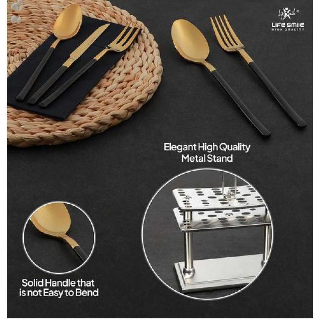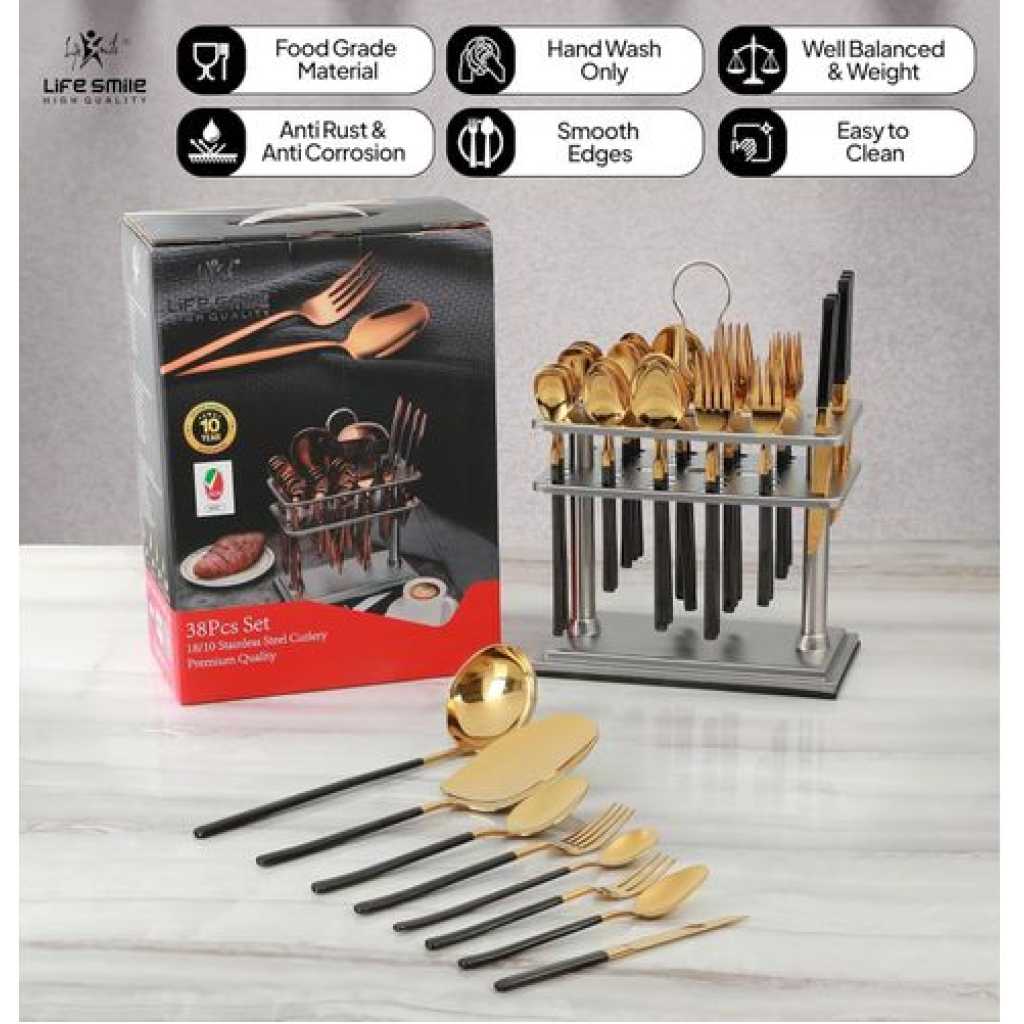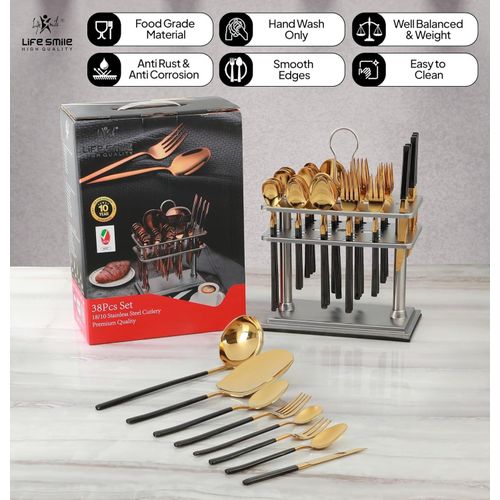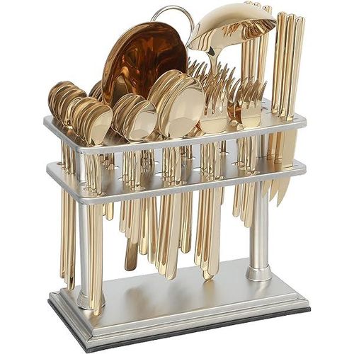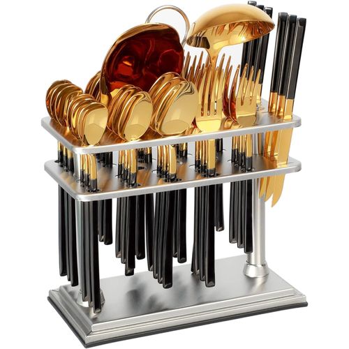 ✅ SHINY GOLD HEAD & SHINY BLACK HANDLE STAINLESS STEEL FLATWARE SET INCLUDES : 38 piece utensils, consist of 6 PCS Dinner Spoon, 6 PCS Tea Spoon , 6 PCS Dinner Fork, 6 PCS Ice Spoon , 6 PCS Fruit Knife , 6 PCS Cake Fork , 1 PC Rice Server , 1 PC Soup ladle with Square Stand ✅ PREMIUM 18/10 PURE STAINLESS STEEL : This flatware set is made of high quality food grade pure stainless steel which is very durable, rust-proof, corrosion resistant, non-toxic, BPA free, no metal aftertaste. Meanwhile, its sturdiness ensures that it will not bend easily providing you with long – term use. Most importantly, they’re dishwasher safe. ✅ USE AND MAINTENANCE: Hand Wash Only , please drying before storage Cutlery Set. DO NOT use In dishwasher , wire brush, hard sponge, cleaning cloth or any other solid material to wash the kitchen set, they will damage the knives spoons and forks set. Your proper maintenance and care will keep it shines forever! ✅ PROPER WEIGHT AND COMFORTABLE HANDLE: Unlike other brands, the curvature of our utensil handles is designed according to the posture of the hand, and the appropriate weight and perfect balance are added to ensure maximum comfort during use that avoids you feel tired. Moreover, the smooth edges ensure safety and no scratches. ✅ HIGH-END ELEGANT SHINY GOLD HEAD & SHINY BLACK HANDLE APPEARANCE: The mysterious SHINY GOLD HEAD & SHINY BLACK HANDLE appearance design, standing out from the ordinary kitchen utensils, creating an elegant, noble and luxurious dining scenes and enhancing your dining experience. There is no need to worry about fading or cracking because the SHINY GOLD HEAD & SHINY BLACK HANDLE utensil set is metal layer from vacuum plating technology. ✅ PERFECT FOR USE: This set is ideal for family daily use, parties, gatherings, family dinners, candlelight dinner, banquet, Thanksgiving, BBQ, wedding and other formal occasions. Also apply to apartment, cabin, home, camping, hotel, restaurant, eatery, bistro, etc or when you need extra flatware set .