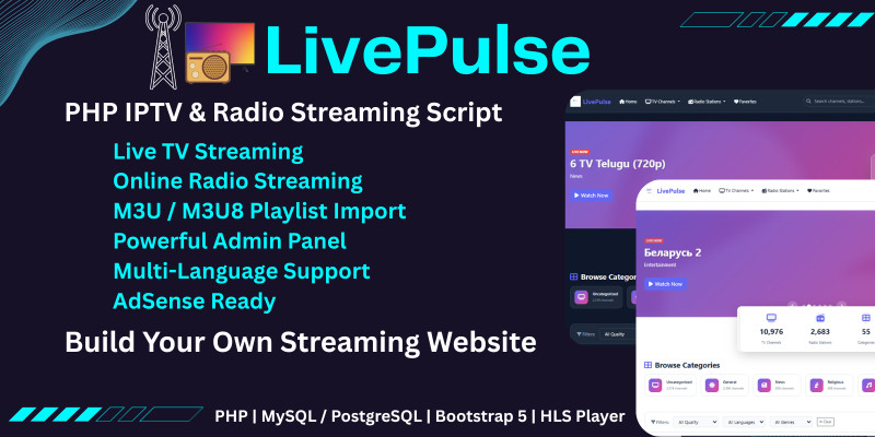 LivePulse – PHP IPTV And Radio Streaming. LivePulse – PHP IPTV & Radio Streaming CMS with Admin Panel, M3U Import, Multi-Language & AdSense Ready