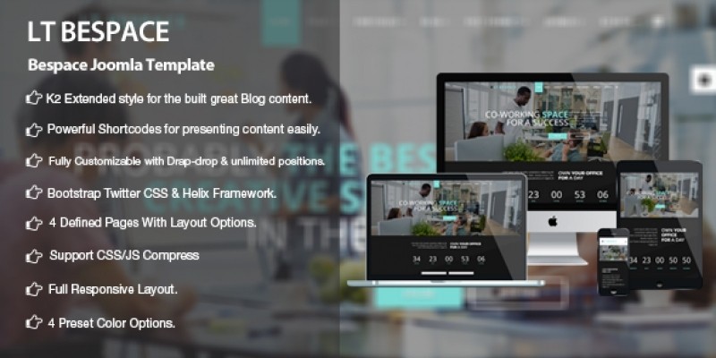 LT Bespace - Coworking Spaces Joomla Template. LT Bespace is responsive joomla template for Coworking Spaces, Meeting, Creative, Conference Space Rentals, Studios and other busi
