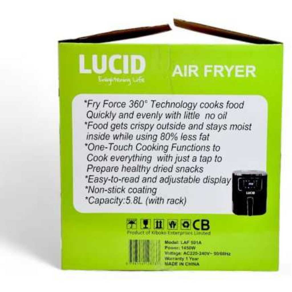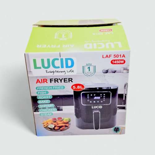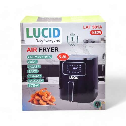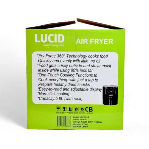 Lucid Air Fryer 5.8L LAF 501A – Healthy Cooking Made Easy Discover the Lucid Air Fryer 5.8L LAF 501A for quick, healthy meals. Enjoy tasty, low-oil cooking with advanced features in Kampala, Uganda. Warranty is 1year Applicable on all technical components. *T&C Apply* Key Features: Lucid Air Fryer 5.8L LAF 501A – Healthy Cooking Made Easy Discover the Lucid Air Fryer 5.8L LAF 501A for quick, healthy meals. Enjoy tasty, low-oil cooking with advanced features in Kampala, Uganda. Warranty is 1year Applicable on all technical components. *T&C Apply*