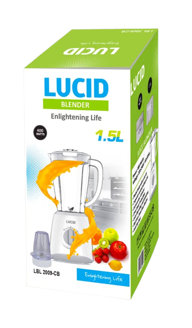 Buy Lucid Blender Model 2009-CB Make life easier in the kitchen by purchasing this 2-in-1 blender for mixing fruit and vegetables and meat, It has a stainless steel blade covered with a layer of silver that will allow you to use it without fear of rust. A blender is a kitchen and laboratory appliance used to mix, purée, or emulsify food and other substances. A stationary blender consists of a blender container with a rotating metal blade at the bottom, powered by an electric motor that is in the base. Power: 400watts Voltage: 220 – 240v – 50-60 Hz Blending Jar capacity: 2litres 2 speed control with pulse Accessories: Grinder Over Heat Protection Juice Blending and grinding Stainless steel star blades Anti-slip feet