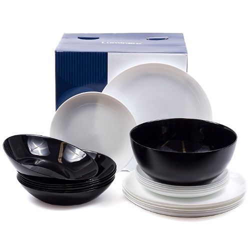 Key Features: Luminarc Diwali Table service 18 + 1 pieces for 6 people Material: Glass-ceramic opal. Set of 6 Plates 25 cm White Set of 6 Sideplates 19 cm White Set of 6 Soup Plates 20 cm Black 1 pc big serving bowl 30cm Black Material: CERAMIC OPAL GLASS Edge protection. Anti-scratch coating. Dishwasher safe Thermal and impact resistance 100% color hygiene Country of manufacture: Arques, France