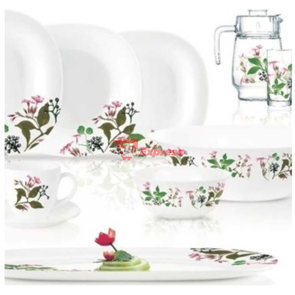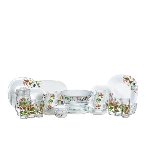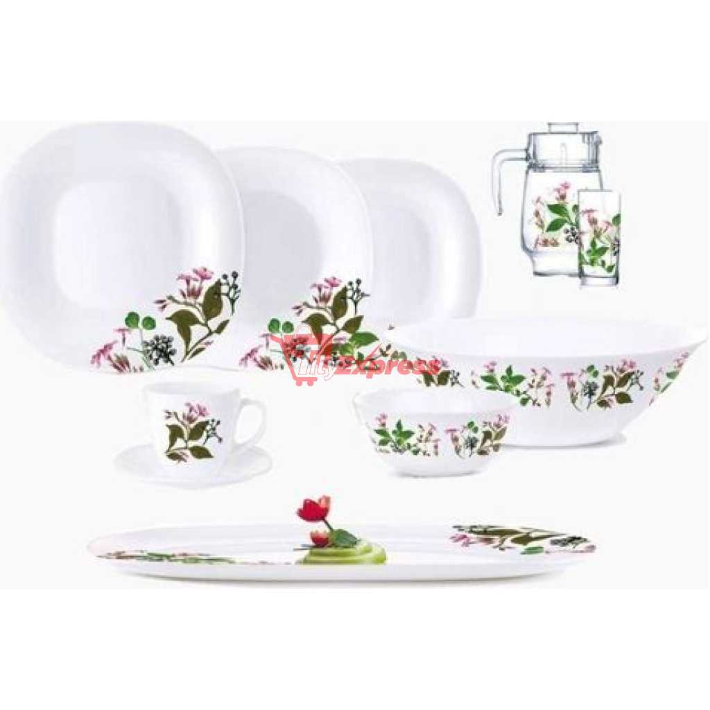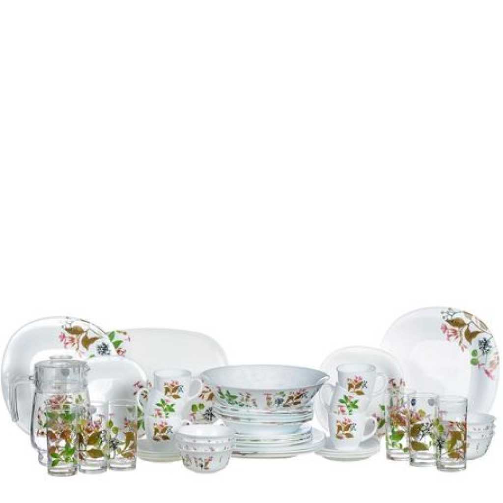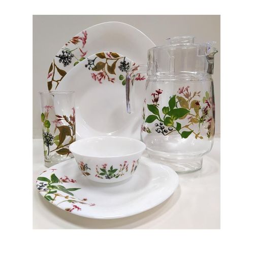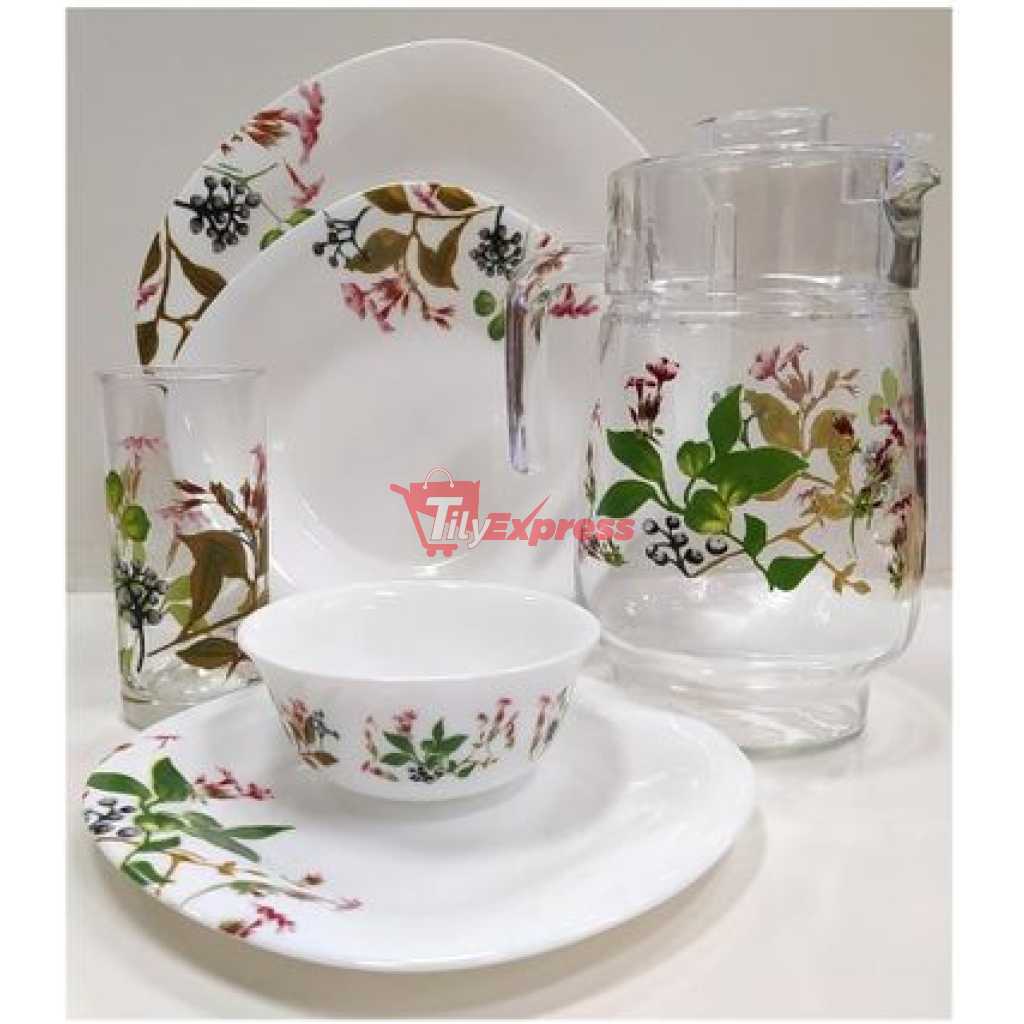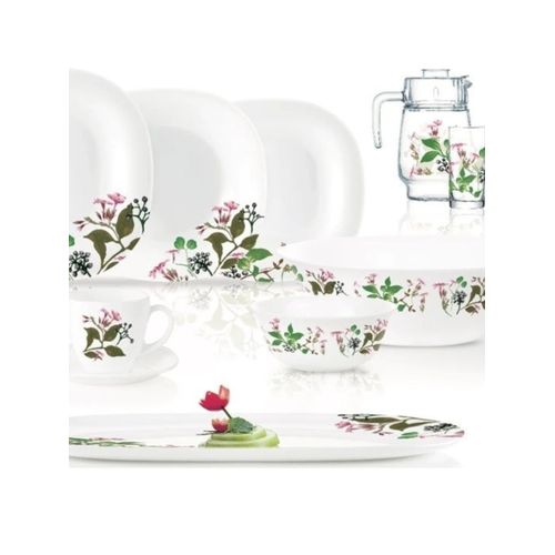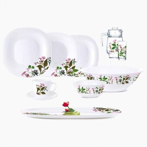 Luminarc Prunier Plates, Cups, Bowls Glass Dinnerware Set, 46 Piece, Multicolor Rice Bowl x 1 (Diameter : 27cm x Height : 8.5cm x Weight : 700g) Jug x 1 (Diameter : 10cm x Height : 21cm x Weight : 960g) Dinner Plate x 6 (Diameter : 24.5cm x Height : 1.5cm x Weight : 430g) Dessert Plate x 6 (Diameter : 19.5cm x Height : 1.5cm x Weight : 280g) Soup Plate x 6 (Diameter : 21cm x Height : 3cm x Weight : 350g) Cereal Bowl x 6 (Diameter : 11.5cm x Height : 5cm x Weight : 170g) Tumbler x 6 (Diameter : 6cm x Height : 13.5cm x Weight : 200g) Cup x 6 (Diameter : 8cm x Height : 6cm x Weight : 170g) Saucer x 6 (Diameter : 14cm x Height : 2cm x Weight : 140g) Oval Plate x 1 (Length : 34.5cm x Width : 25.5cm x Height : 2.5cm x Weight : 800g) Fully tempered 3 x more resistanceFood safe100% hygienicMicrowave safe dishwasher safeHigh thermal shock resistanceZero cadmium lead.