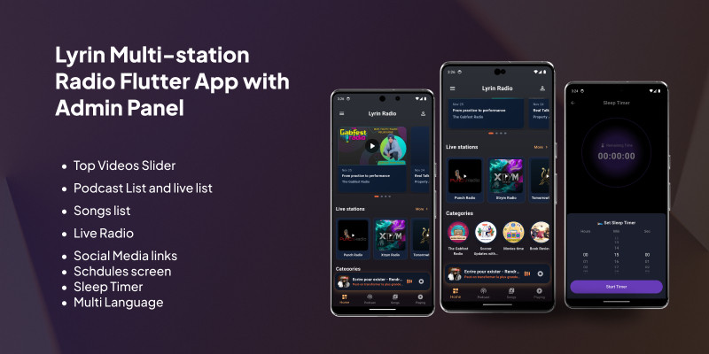 Lyrin Multi-station Radio App with Admin Panel. Podcast,Songs like spotify,radio live ,video carasoul ,schdules all in one place