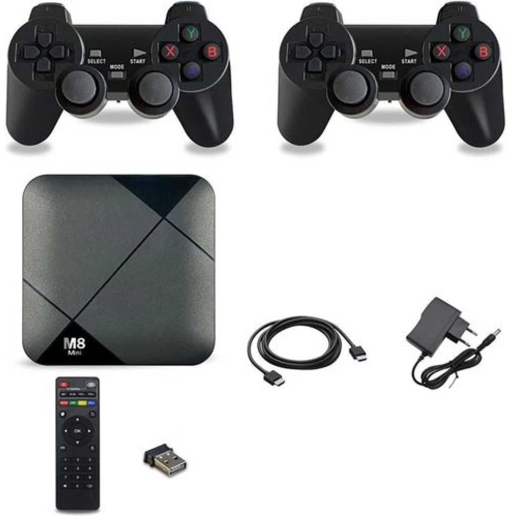 Product description About M8 Mini Video Game Console: ( Android TV & 1 Games Console ) Built-in pre-installed video game console 10000 TV games, which can be played as downloaded and installed. In addition, this super box can also be switched to Android TV 9.0 system, you can download the APP in this mode, you can also watch news and watch videos on TV