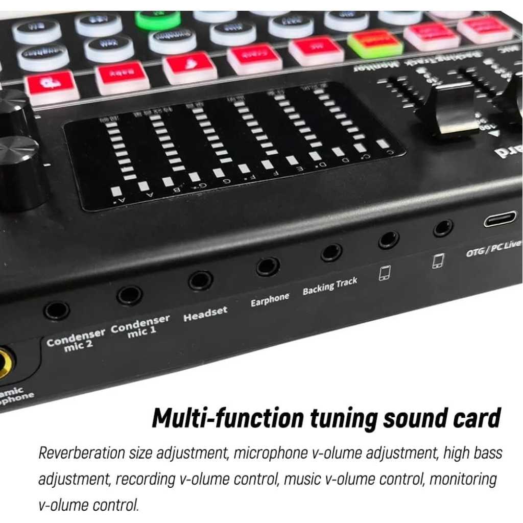 Key Features: Adjustable high/middle/low p-itch, the high p-itch makes the sound full and c-lear with a sense of penetration, the middle p-itch makes the sound ray more stable, and the bass is cleaner and transparent. -button elimination of the sound, effectively eliminating the singing voice, the sound is clearer and more p-enetrating during live broadcast.Live broadcast mode, can be switched with button, easy to deal with various occasions, let you be more professional in live broadcast. Electronic tone, professional-level electronic tone adjustment, customized and personalized different electronic tone, change different sounds. Multi-function tuning sound card, complete functions, simple operation, easy to use, built-in lithium battery. universal for mobilephones and computers. Automatically recognize the sound, intelligently the v-olume of background music.