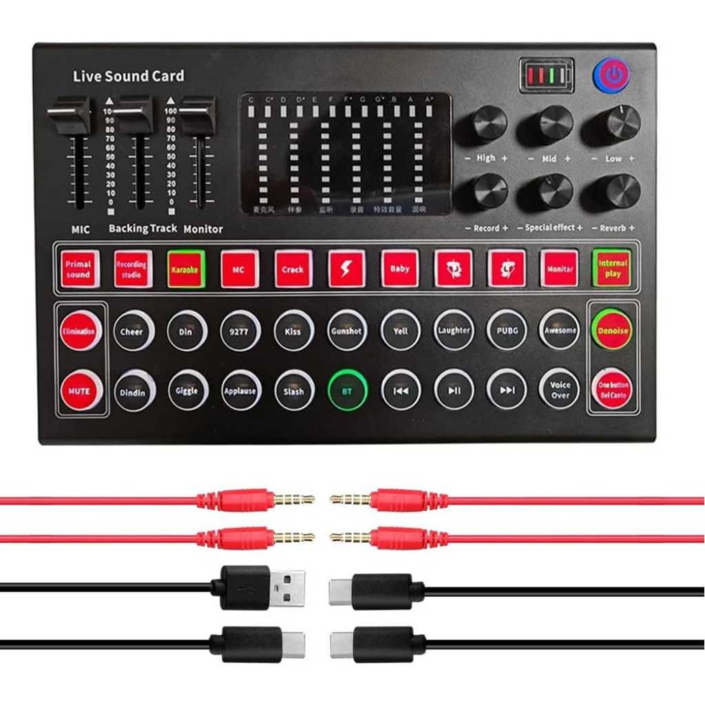Color: black Material: plastics Output sampling rate: 44.1KHz Number of sampling bits: 16bit SNR: 80-85dB Battery: 3.7V, 1200mAh size: 235 * 150 * 35mm / 9.2 * 5.9 * 1.4in Features: Multi-function tuning sound card, complete functions, simple operation, easy to use, built-in lithium battery. universal for mobilephones and computers. Adjustable high/middle/low p-itch, the high p-itch makes the sound full and c-lear with a sense of penetration, the middle p-itch makes the sound ray more stable, and the bass is cleaner and transparent. -button elimination of the sound, effectively eliminating the singing voice, the sound is clearer and more p-enetrating during live broadcast. Live broadcast mode, can be switched with button, easy to deal with various occasions, let you be more professional in live broadcast. Electronic tone, professional-level electronic tone adjustment, customized and personalized different electronic tone, change different sounds. Warm up a-tmosphere sound effects, can vividly e-xpress the mood of the live player through the a-tmosphere. Automatically recognize the sound, intelligently the v-olume of background music. Reverberation size adjustment, microphone v-olume adjustment, high bass adjustment, recording v-olume control, music v-olume control, monitoring v-olume control. Packing List: 1 * Sound Card 2 * Audio Cable 1 * USB Cable 1 * Mobilephone Connect Cable 1 * User Manual Please Note: Due to the different monitor and light effect, the actual color of the item might be slightly different from the color showed on the pictures. Please