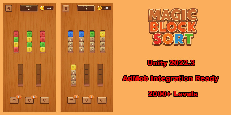 Magic Block Sort - Unity Source Code. Color Block Sort Puzzle with 2000+ levels, boosters, AdMob ads integration, and easy-to-reskin 2D graphics.