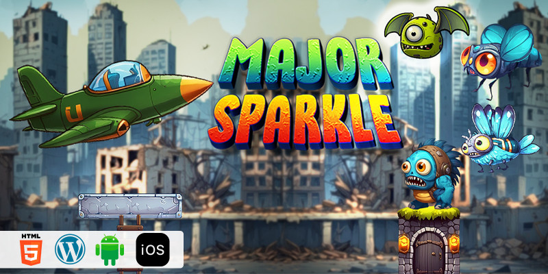 Major Sparkle - HTML5 Construct3 Game. Shoot the historic monster with a fighter plane. Explore the world of the historic war between monsters.