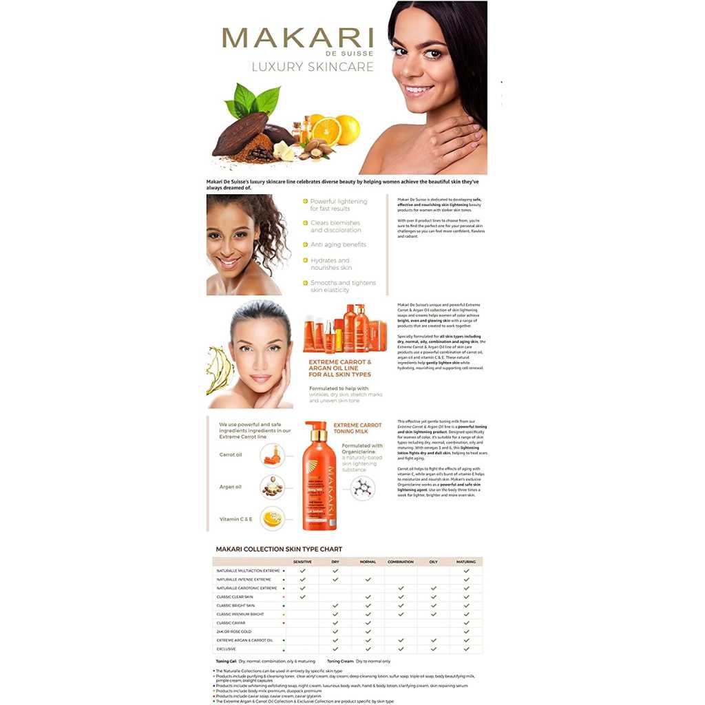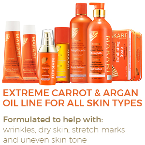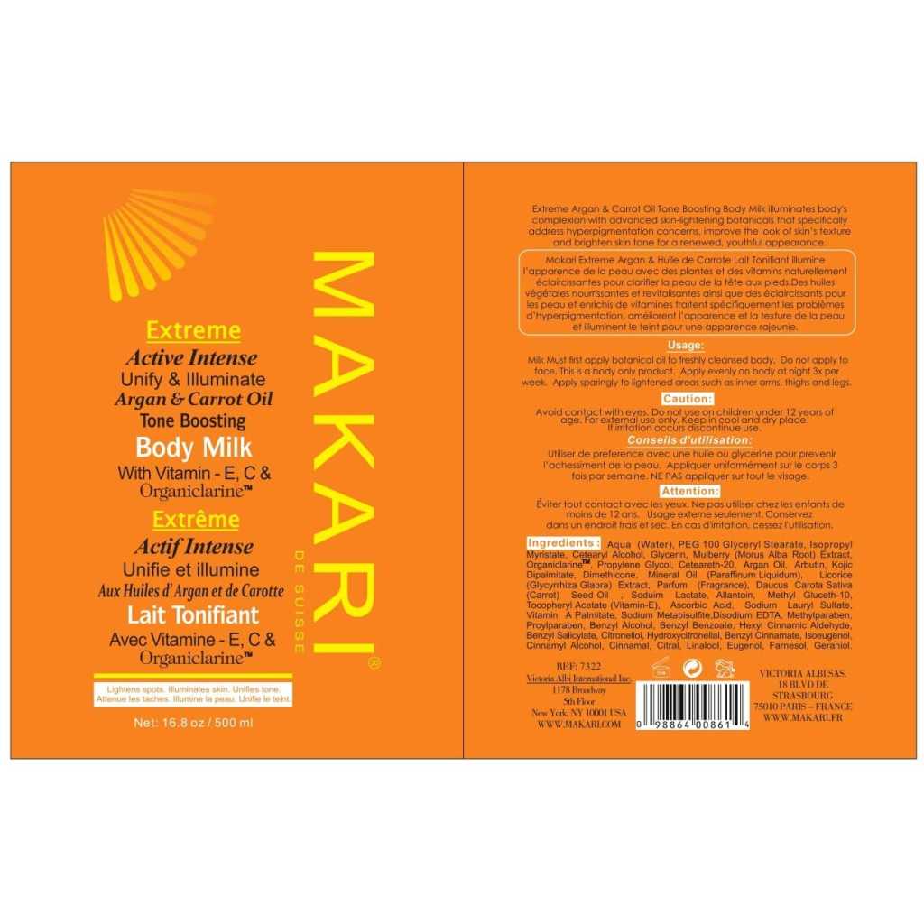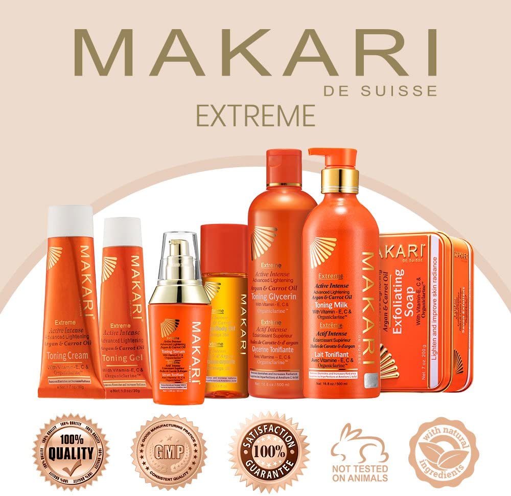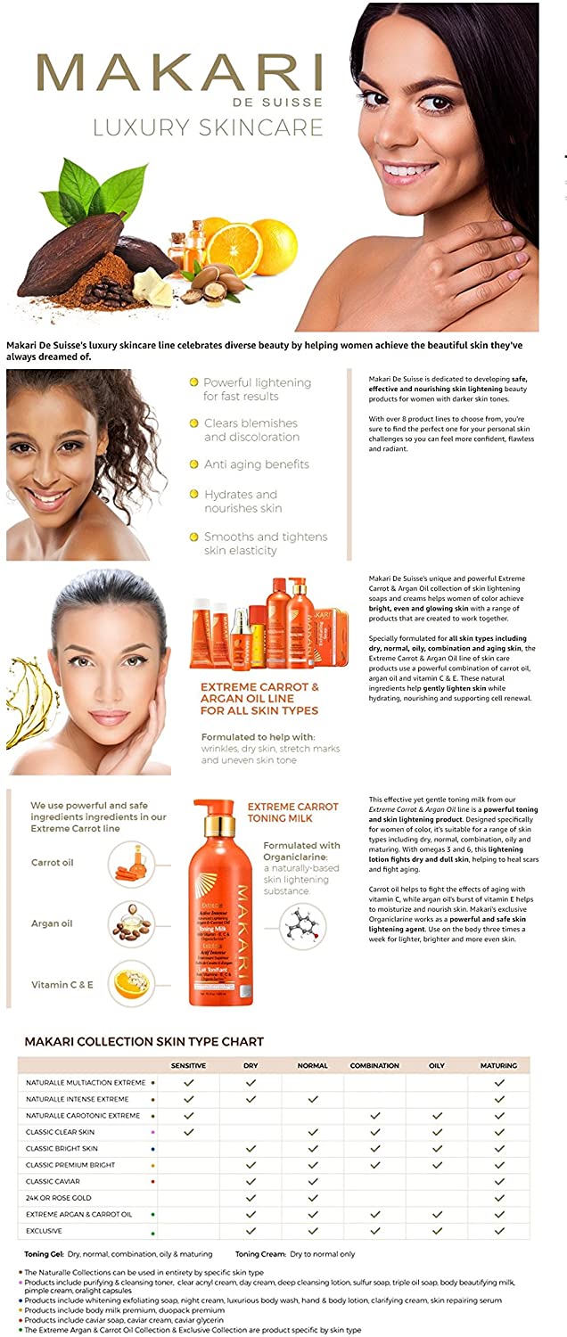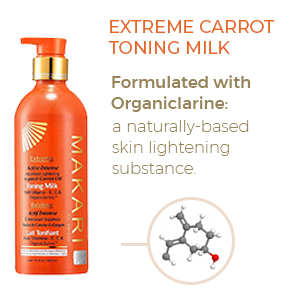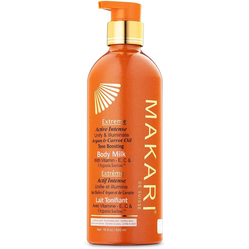 Take luxurious skin care to the extreme. For years, women of color have sought high-end skincare products designed exclusively for their unique concerns. Finally, with the Extreme collection by Makari, everyone can achieve the clear, smooth, glowing complexion they’ve always dreamed of. Specially formulated for all skin types, our rejuvenating Extreme Carrot & Argan Oil Toning Milk is enriched with Organiclarine, a naturally derived active whitening agent. Regularly apply lotion all over skin, and watch as dark spots, acne blemishes, scars, and hyperpigmentation fade away for a fresh, youthful, perfectly even appearance. Infused with antioxidant-rich vitamins C and E, it also smooths uneven texture and tightens saggy skin for maximum anti-aging effects. Use routinely with Makari’s complete line of Extreme lightening products to achieve your ideal shade of beautiful! What You Get 1 x 16.8oz Bottle of Extreme Toning BODY MILK by Makari A safe alternative to harmful skin bleaching creams Rejuvenating vitamins and oils that tone and heal A luxury lotion specially designed for beautiful black skin! Specs & Details 16.8 ounces [500ml] Contains naturally-based Organiclarine No chemicals or bleach Cruelty free Hydroquinone free Gentle enough for daily use How to Enjoy Apply and massage into uneven skin all over the body Never use on or around the face and eyes [body only] Repeat daily for maximum lightening and tightening results See dark marks, blemishes, and wrinkles disappear Unveil your glowing complexion in as little as two weeks! Key Features: POWERFUL SKIN LIGHTENING – Maximum Strength Organiclarine Safely Whitens & Brightens Skin for Fast, Effective Results PERFECTLY EVENS TONE – Use Every Day to Gradually Lighten Skin & Achieve a Clear, Healthy, Radiant Complexion QUICKLY CLEARS BLEMISHES – Vitamins C & E Reduce Discoloration From Acne, Sun Patches, Scars, Age Spots & Melasma GENTLY SMOOTHS & TIGHTENS – Rejuvenating Carrot & Argan Oils Soften Lines & Wrinkles; Safe for African-American & Most Skin Types ALL NATURAL ELEMENTS – Cruelty- & Chemical-Free Formula Contains Plant-Based Glycerin & Vitamins From the Earth & Sea