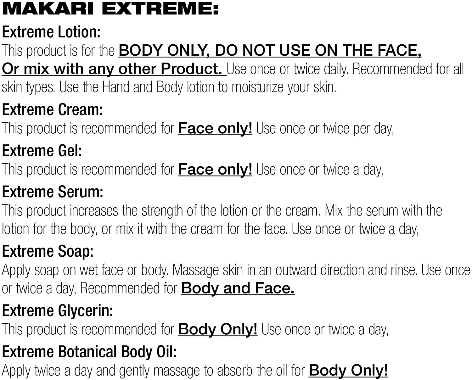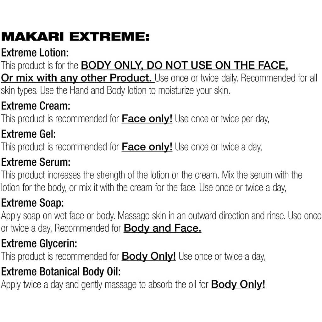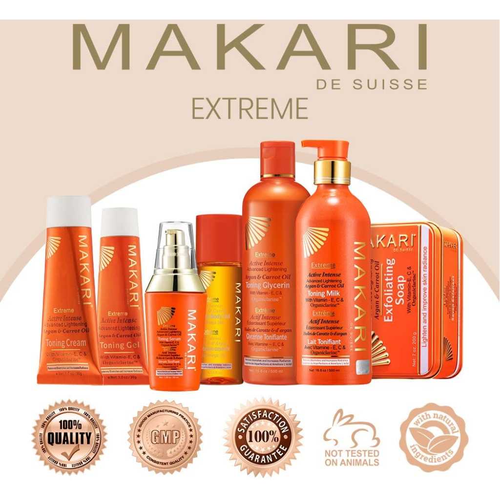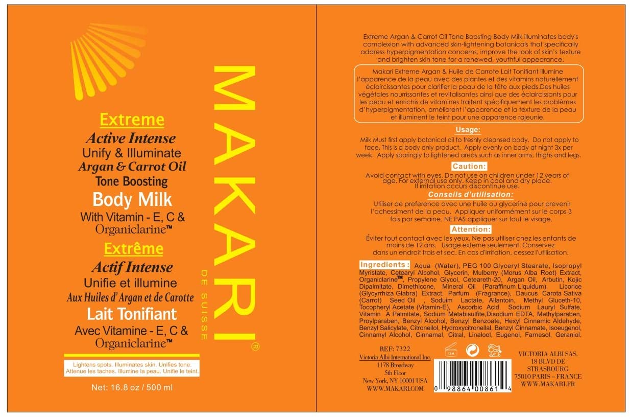 Take luxurious skin care to the extreme. For years, women of color have sought high-end skincare products designed exclusively for their unique concerns. Finally, with the Extreme collection by Makari, everyone can achieve the clear, smooth, glowing complexion they’ve always dreamed of. Specially formulated for all skin types, our rejuvenating Extreme Carrot & Argan Oil Toning Milk is enriched with Organiclarine, a naturally derived active whitening agent. Regularly apply lotion all over skin, and watch as dark spots, acne blemishes, scars, and hyperpigmentation fade away for a fresh, youthful, perfectly even appearance. Infused with antioxidant-rich vitamins C and E, it also smooths uneven texture and tightens saggy skin for maximum anti-aging effects. Use routinely with Makari’s complete line of Extreme lightening products to achieve your ideal shade of beautiful! What You Get 1 x 16.8oz Bottle of Extreme Toning BODY MILK by Makari A safe alternative to harmful skin bleaching creams Rejuvenating vitamins and oils that tone and heal A luxury lotion specially designed for beautiful black skin! Specs & Details 16.8 ounces [500ml] Contains naturally-based Organiclarine No chemicals or bleach Cruelty free Hydroquinone free Gentle enough for daily use How to Enjoy Apply and massage into uneven skin all over the body Never use on or around the face and eyes [body only] Repeat daily for maximum lightening and tightening results See dark marks, blemishes, and wrinkles disappear Unveil your glowing complexion in as little as two weeks! Key Features: POWERFUL SKIN LIGHTENING – Maximum Strength Organiclarine Safely Whitens & Brightens Skin for Fast, Effective Results PERFECTLY EVENS TONE – Use Every Day to Gradually Lighten Skin & Achieve a Clear, Healthy, Radiant Complexion QUICKLY CLEARS BLEMISHES – Vitamins C & E Reduce Discoloration From Acne, Sun Patches, Scars, Age Spots & Melasma GENTLY SMOOTHS & TIGHTENS – Rejuvenating Carrot & Argan Oils Soften Lines & Wrinkles; Safe for African-American & Most Skin Types ALL NATURAL ELEMENTS – Cruelty- & Chemical-Free Formula Contains Plant-Based Glycerin & Vitamins From the Earth & Sea