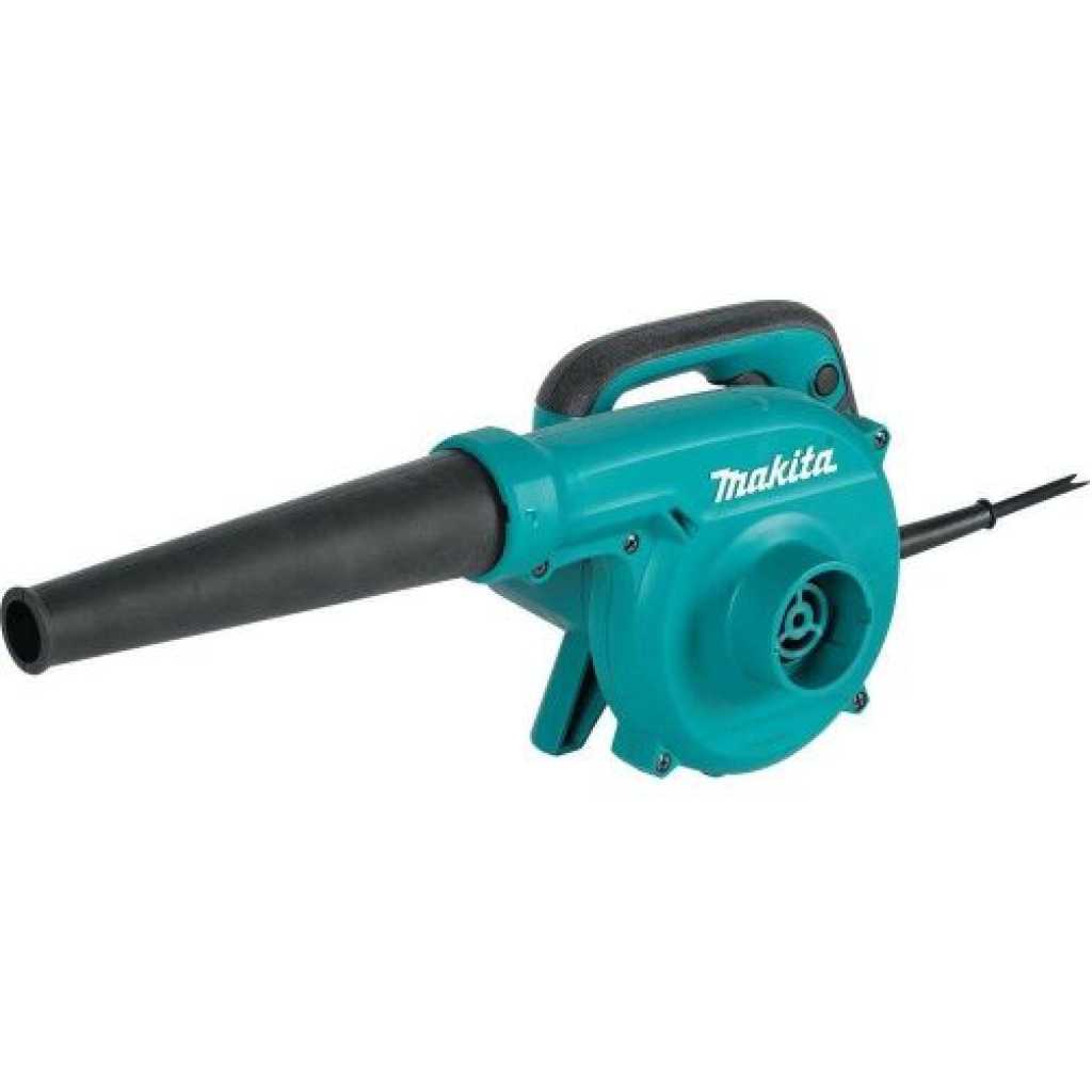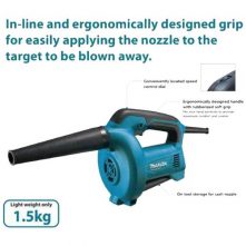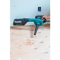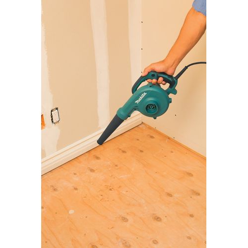 Makita UB1103 Blower – Blue and Black. The Makita Blower (model UB1103) is a go-to tool for fast clean upon the jobsite or in the workshop. The Blower is powered by a 6.8 AMP motor with a variable speed control dial and trigger with lock-on for added convenience. With a maximum air speed of 203 MPH and a maximum air volume of 145 CFM, you’ll get faster clean-ups. The blower can also be used as a vacuum; simply move the nozzle to the vacuum port and connect the dust bag.